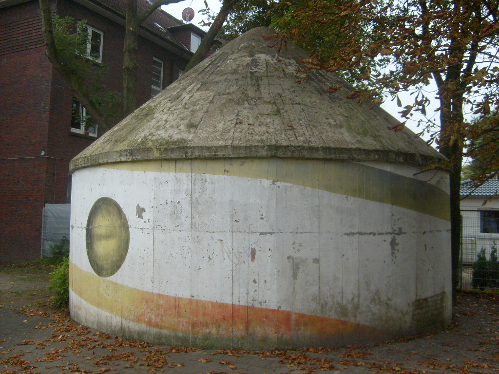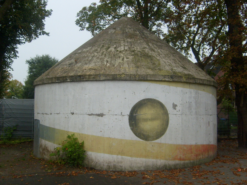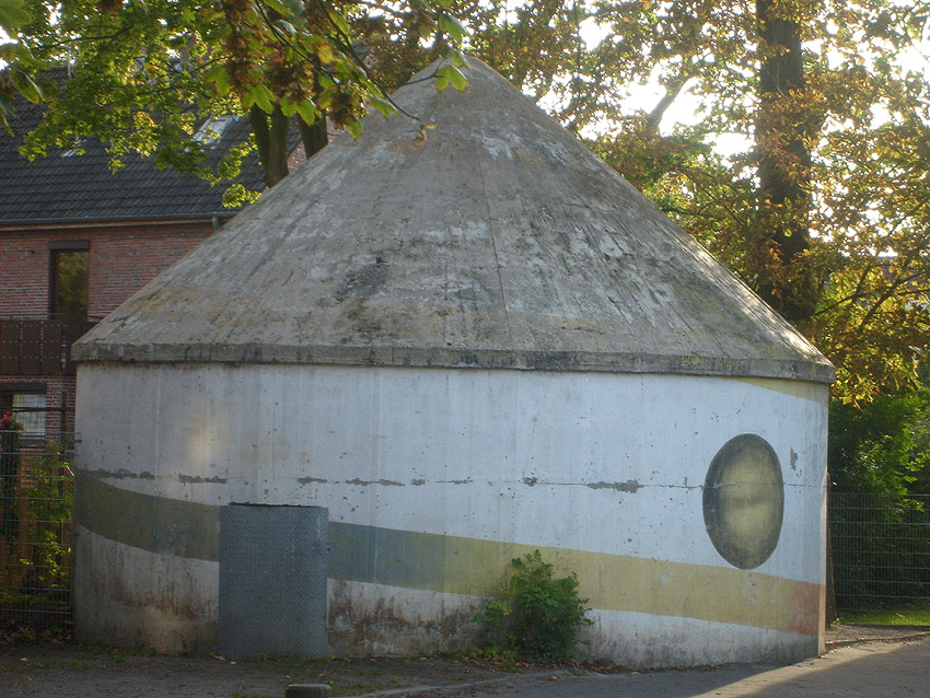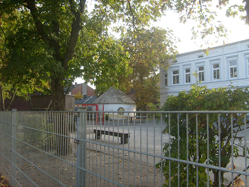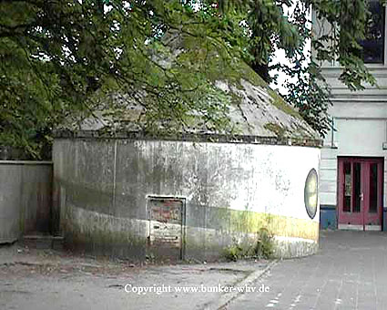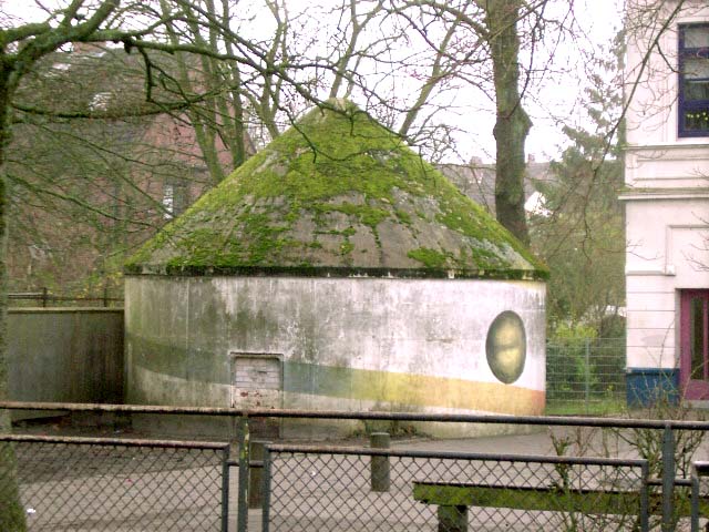 Wie auch beim baugleichen Rundbunker auf dem Schulhof der Franziskusschule ist zu sehen, dass der Haupteingang stets vom Gebäude weg zeigte. Im Falle einer Zertrümmerung des Gebäudes durch Bombentreffer sollte der Zugang keinesfalls verschüttet werden.