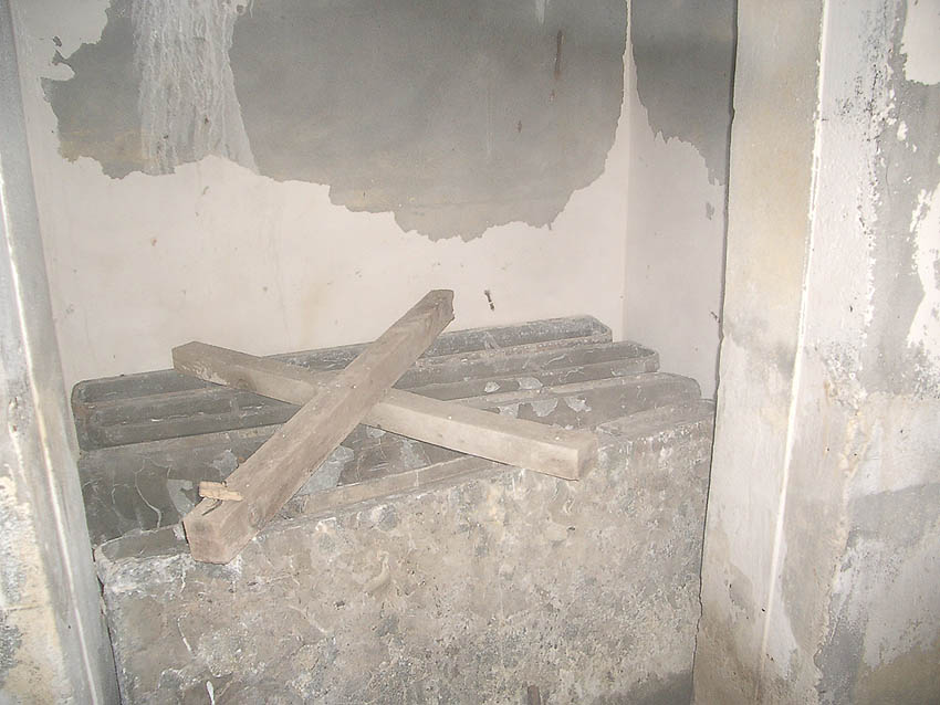 Neben dem Eingang befindet sich an der Südseite ein gemauertes Podest. Der "Innenraum" ist hohl, wahrscheinlich war er ursprünglich mit Sand aufgefüllt...