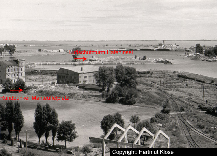 Mitte / unten links zu sehen Rundbunker Südzentrale, Mitte / unten rechts Rundbunker Manteuffelplatz, auf dem Platz ein Sperrballon, oben mittig Rundbunkerverdacht im Hinterhof Manteuffelstraße / Rheinstraße.