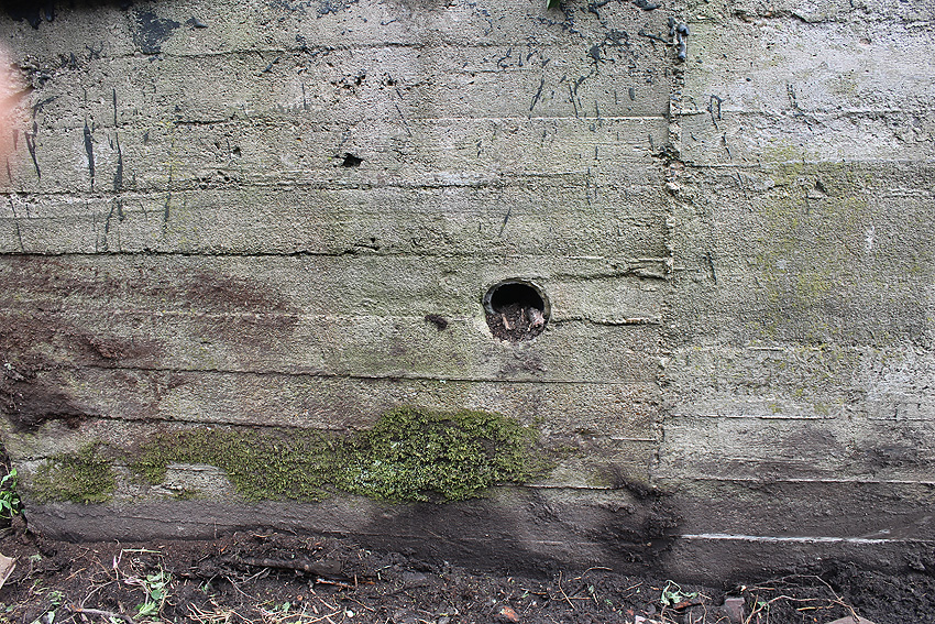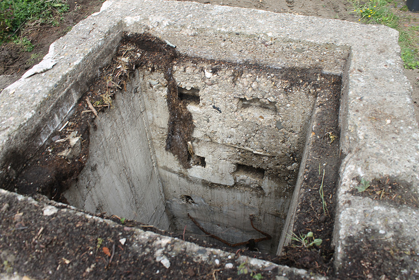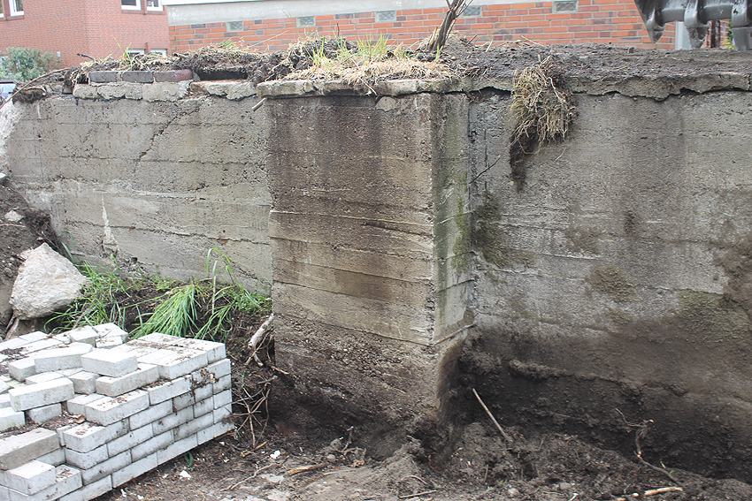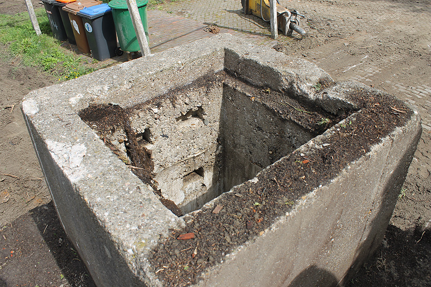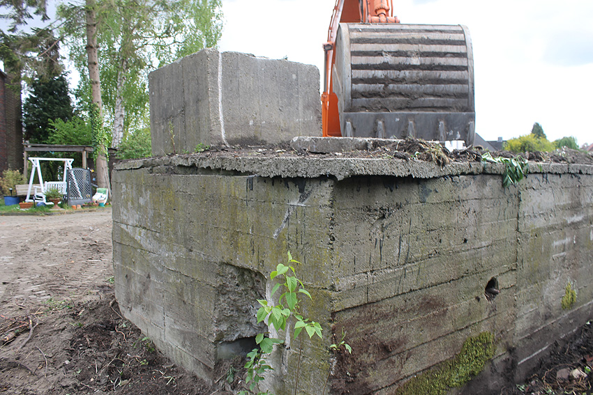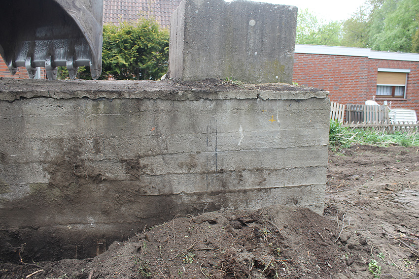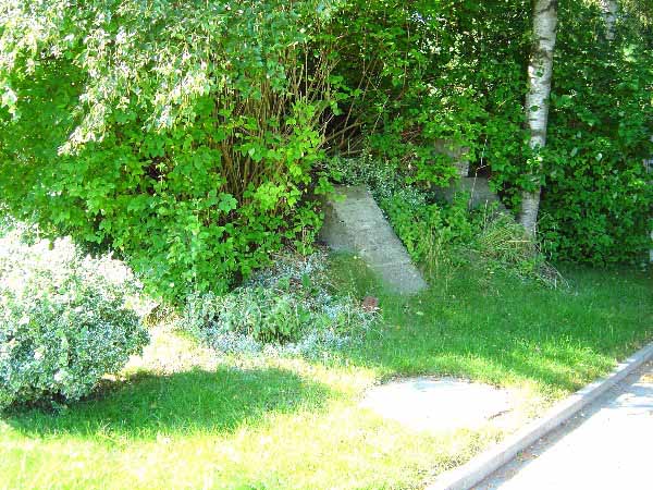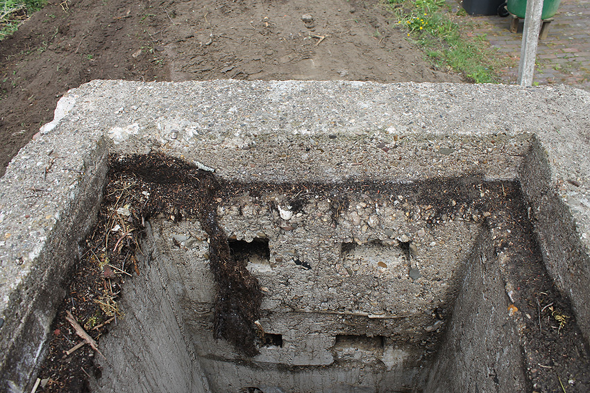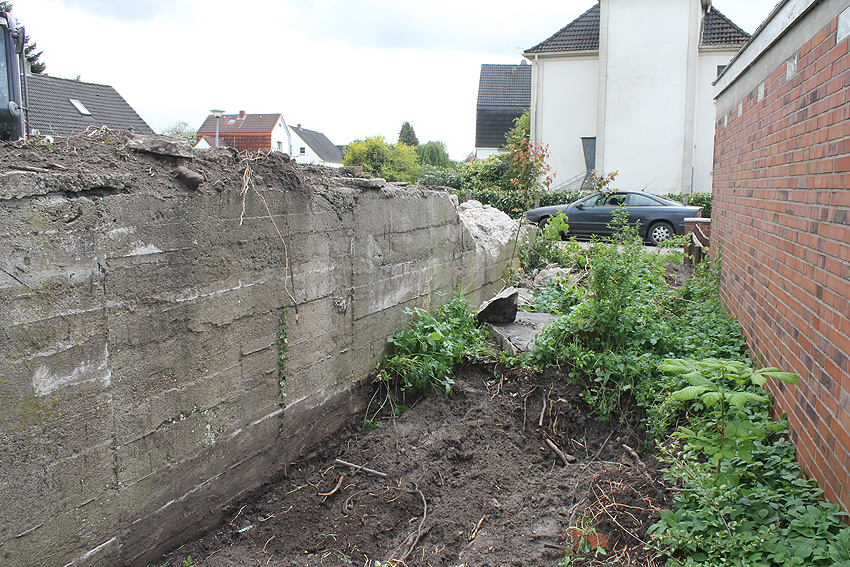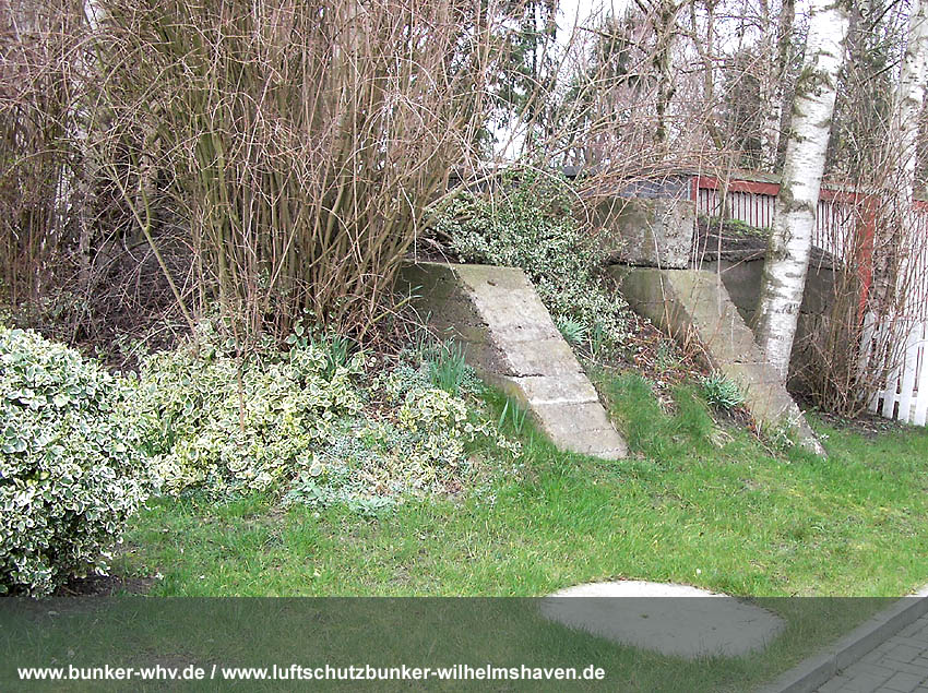 Nachtrag Mai 2020: Dies ist die untere Hälfte vom Eingangsbau des Deckungsgrabens Am Tief / Verbindungsstraße. Der Oberbereich wurde nach dem Krieg entfernt. Der Graben wurde Ende April bis Anfang Mai 2020 über Erdgleiche abgerissen. Interessant: Die nahe Anlage Lindenstraße besteht lediglich im ersten Grabenabschnitt. Der hintere abgeknickte "L-Bereich" wurde für die nachkriegszeitige rückwärtige Erweiterung des anliegenden Wohnhauses beseitigt. Auch der Eingangsvorbau wurde entfernt (für eine Garageneinfahrt). Die Anlagen gehören einer Serie mit zwei Deckungsgräben in Heidmühle und einem in Moorwarfen an. Eine "verdoppelte" Version in Zickzackform existiert noch heute in Middelsfähr, eine weitere Anlage gab es in Sande.