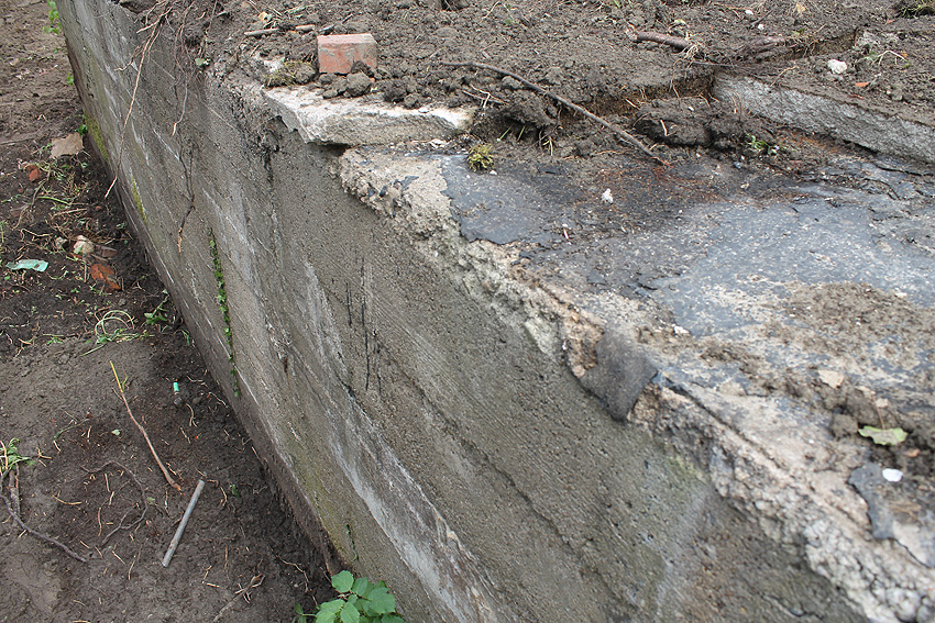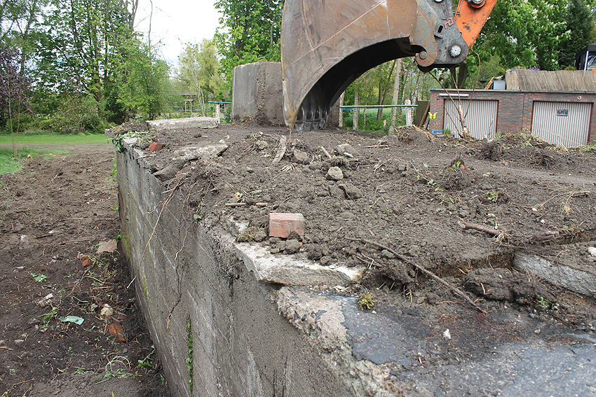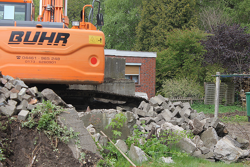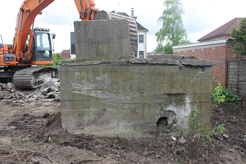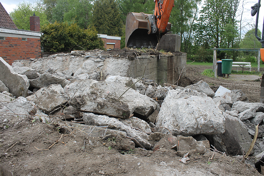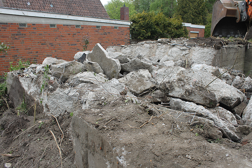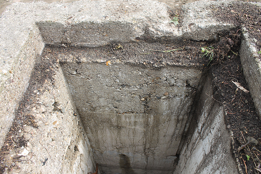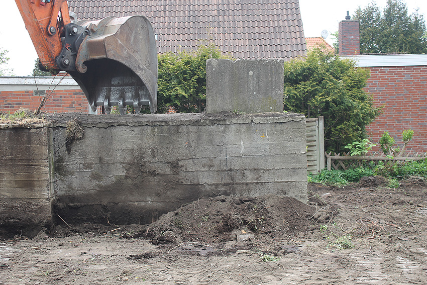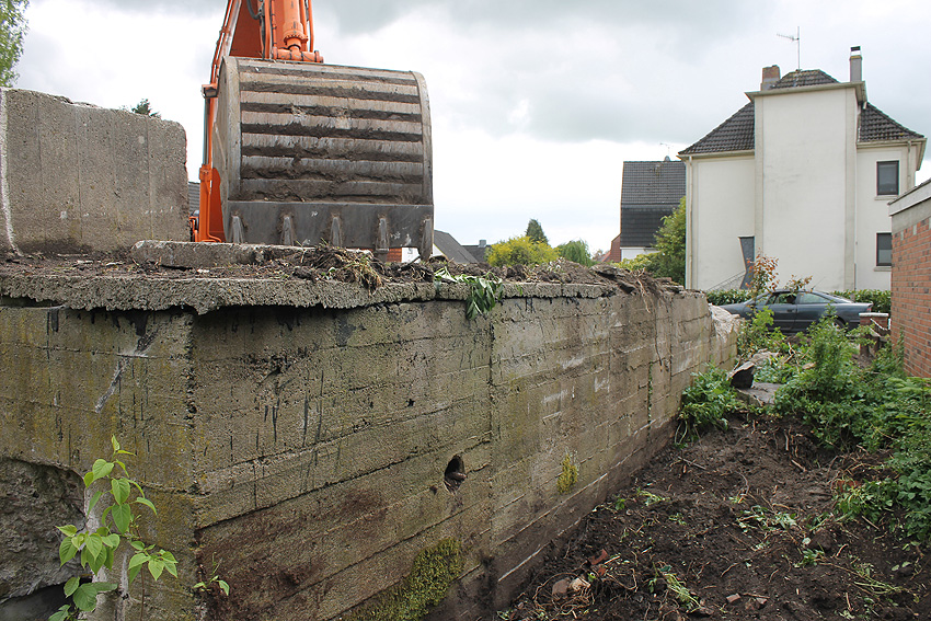 Nachtrag Mai 2020: Dies ist die untere Hälfte vom Eingangsbau des Deckungsgrabens Am Tief / Verbindungsstraße. Der Oberbereich wurde nach dem Krieg entfernt. Der Graben wurde Ende April bis Anfang Mai 2020 über Erdgleiche abgerissen. Interessant: Die nahe Anlage Lindenstraße besteht lediglich im ersten Grabenabschnitt. Der hintere abgeknickte "L-Bereich" wurde für die nachkriegszeitige rückwärtige Erweiterung des anliegenden Wohnhauses beseitigt. Auch der Eingangsvorbau wurde entfernt (für eine Garageneinfahrt). Die Anlagen gehören einer Serie mit zwei Deckungsgräben in Heidmühle und einem in Moorwarfen an. Eine "verdoppelte" Version in Zickzackform existiert noch heute in Middelsfähr, eine weitere Anlage gab es in Sande.