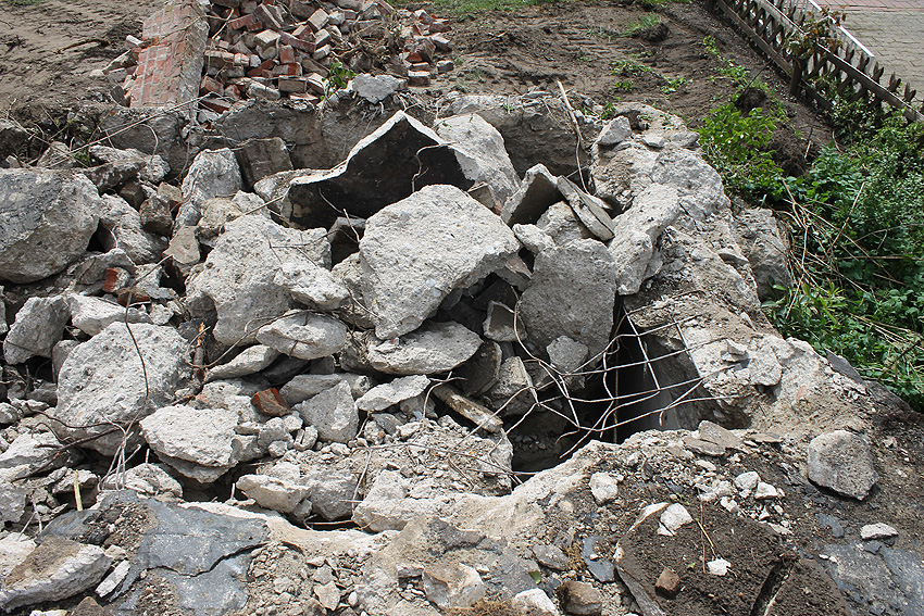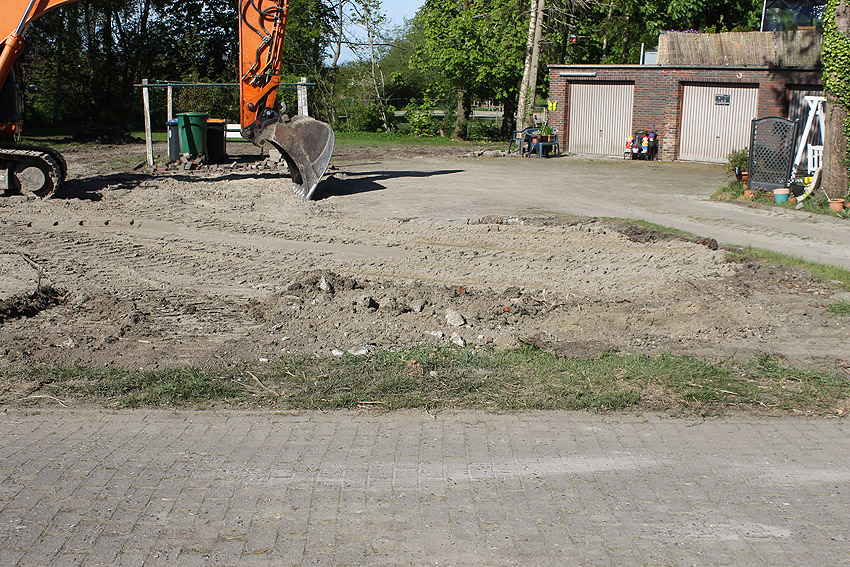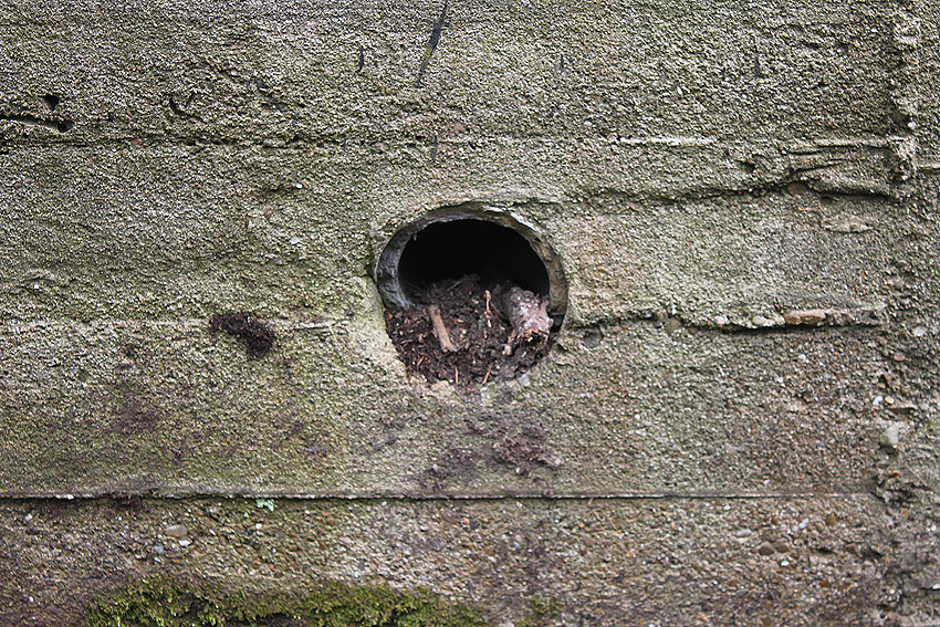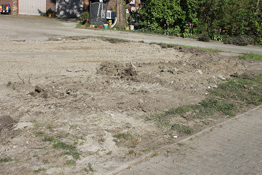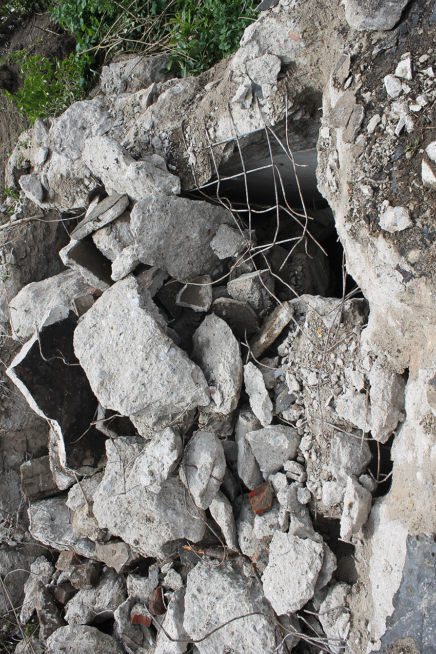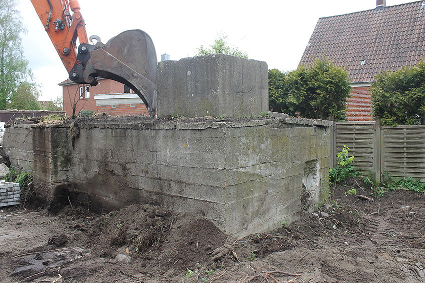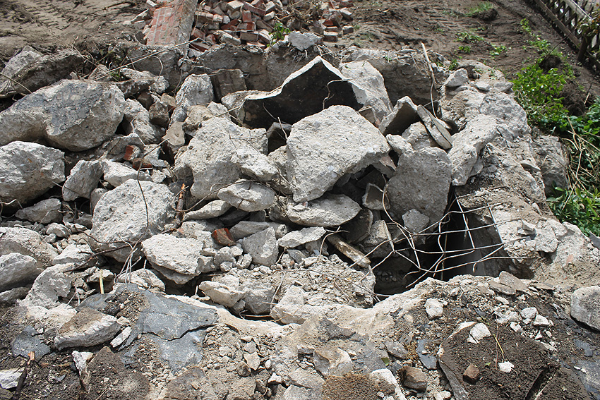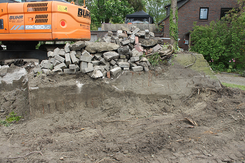 Nachtrag Mai 2020: Dies ist die untere Hälfte vom Eingangsbau des Deckungsgrabens Am Tief / Verbindungsstraße. Der Oberbereich wurde nach dem Krieg entfernt. Der Graben wurde Ende April bis Anfang Mai 2020 über Erdgleiche abgerissen. Interessant: Die nahe Anlage Lindenstraße besteht lediglich im ersten Grabenabschnitt. Der hintere abgeknickte "L-Bereich" wurde für die nachkriegszeitige rückwärtige Erweiterung des anliegenden Wohnhauses beseitigt. Auch der Eingangsvorbau wurde entfernt (für eine Garageneinfahrt). Die Anlagen gehören einer Serie mit zwei Deckungsgräben in Heidmühle und einem in Moorwarfen an. Eine "verdoppelte" Version in Zickzackform existiert noch heute in Middelsfähr, eine weitere Anlage gab es in Sande.