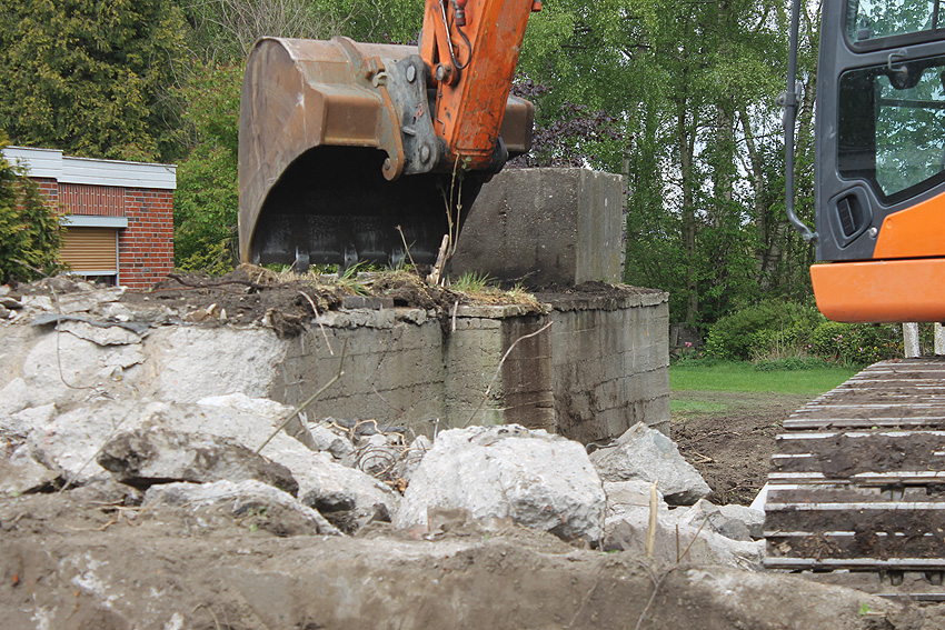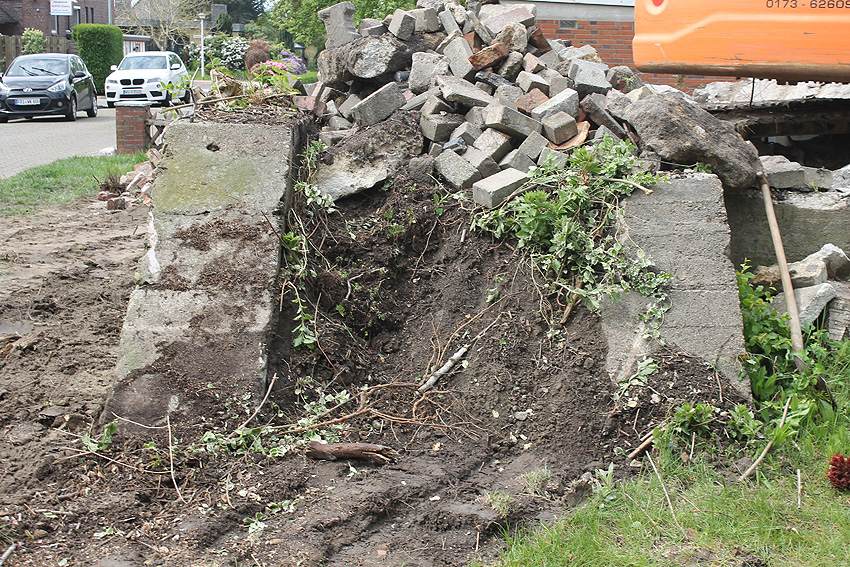 06.05.20: Über Erdgleiche ist sämtliche Baustruktur innerhalb weniger Tage entfernt worden (wohl am 28.04./29.04./30.04./04.05./05.05./06.05). Die unteren Wandbereiche (beginnend etwa 20 cm unter Erdoberfläche) und der Sockel sind erhalten geblieben. Ein Neubau mit Tiefgründung wird hier nicht geplant sein.