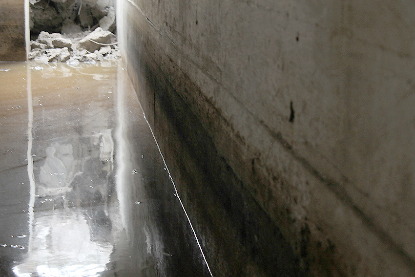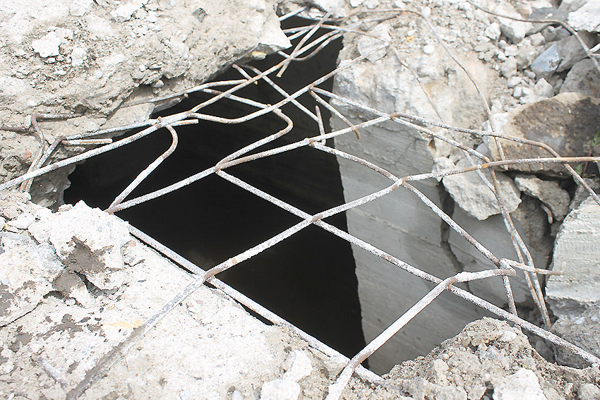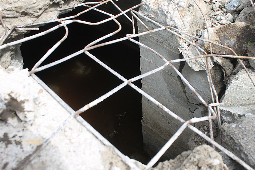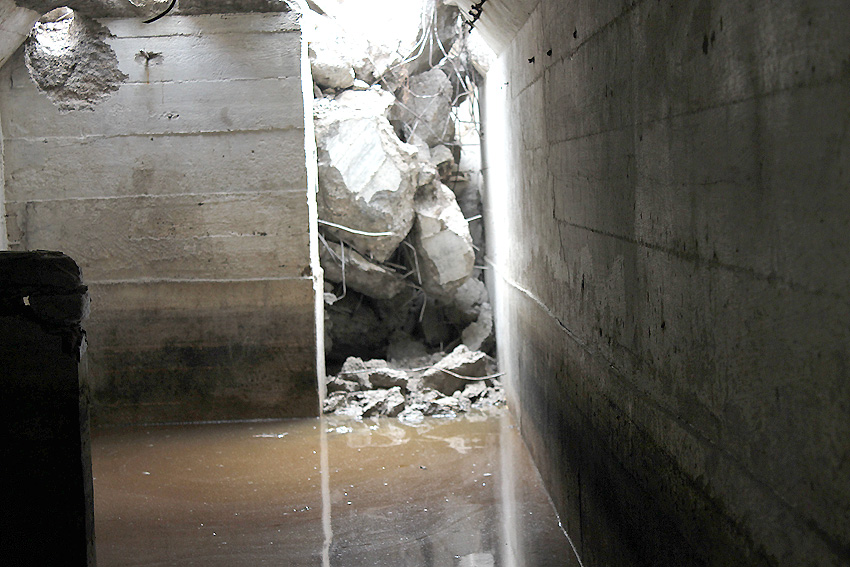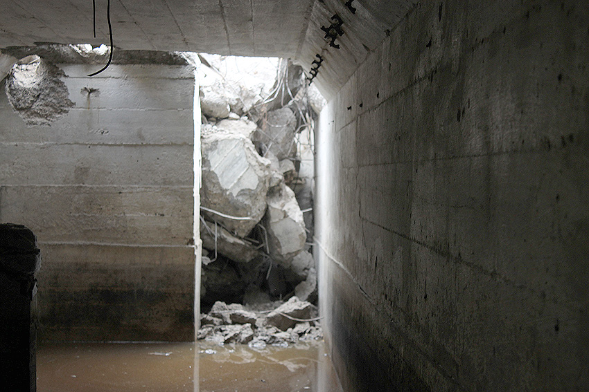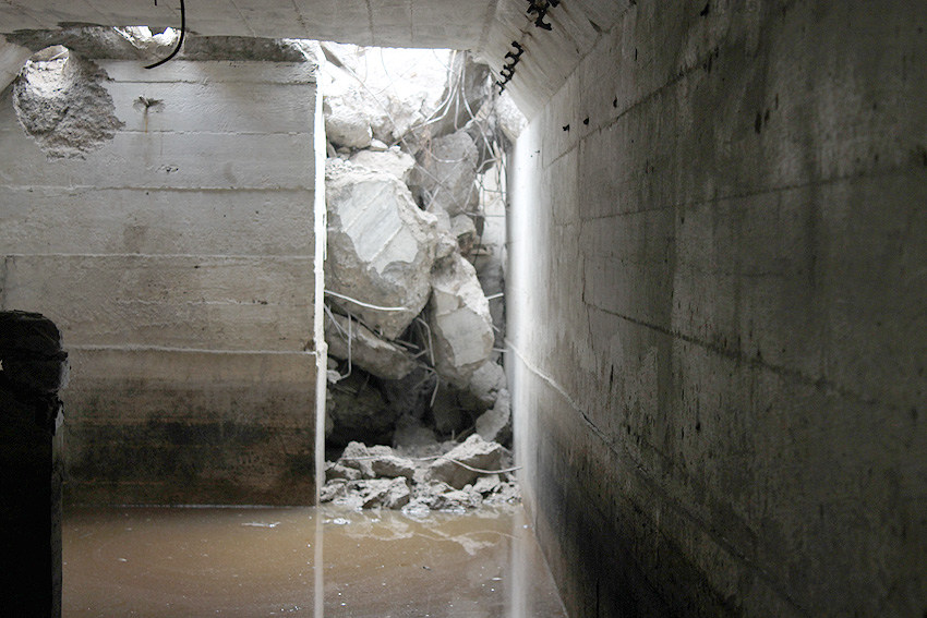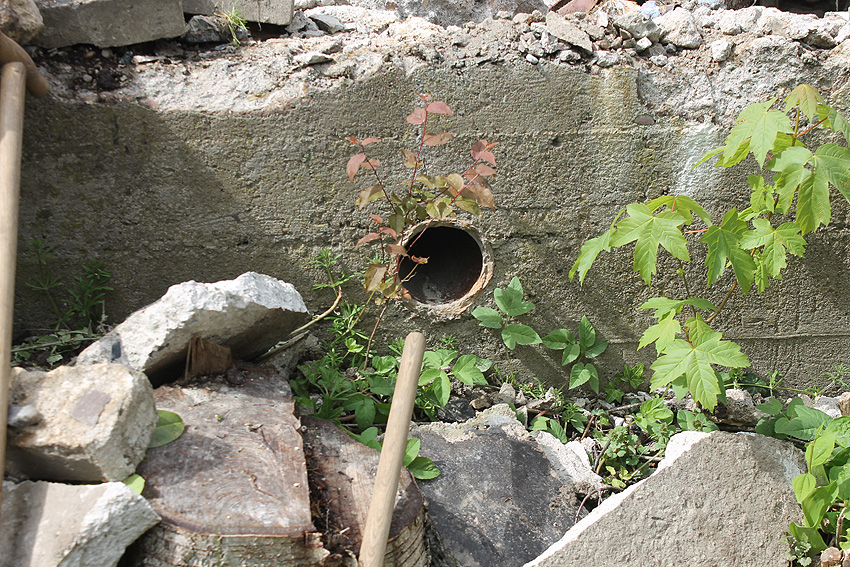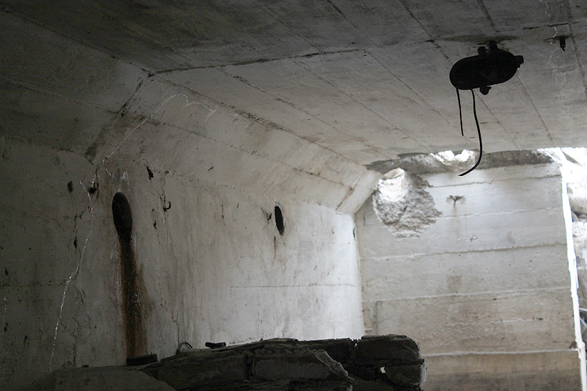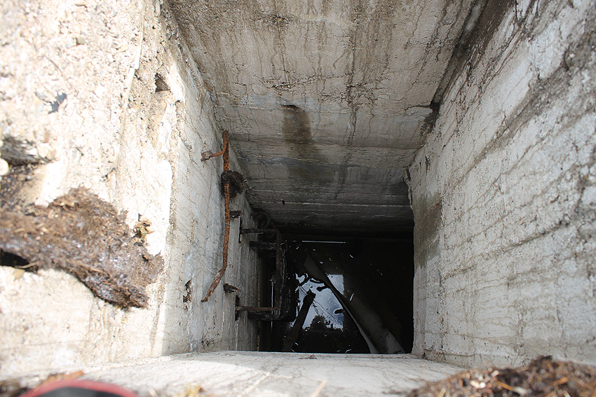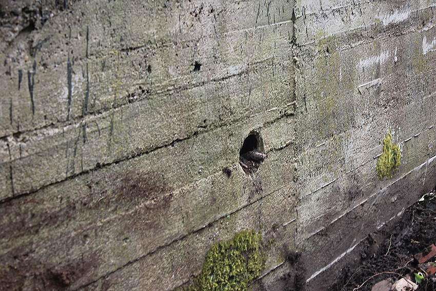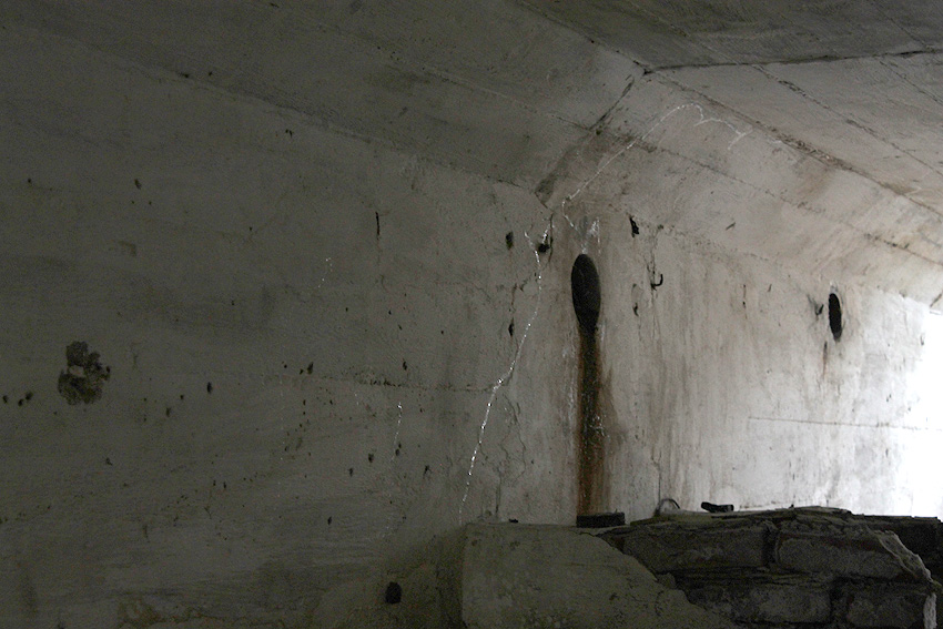 Die Öffnung am Grabenende in der Wand scheint älter zu sein. Eventuell wurde sie bereits während der Fertigung eingebracht. Zweck unbekannt. Die hellen Bereiche an deren Kante sind Absinterungen. Im Innenbereich der Öffnung wurde nachträglich angeputzt (helle Strukturen). Es könnte auch sein, dass die Öffnung nach dem Krieg als "Pumpen-Zugang" geschaffen wurde und der Graben gewisse Zeit als Zisterne diente.