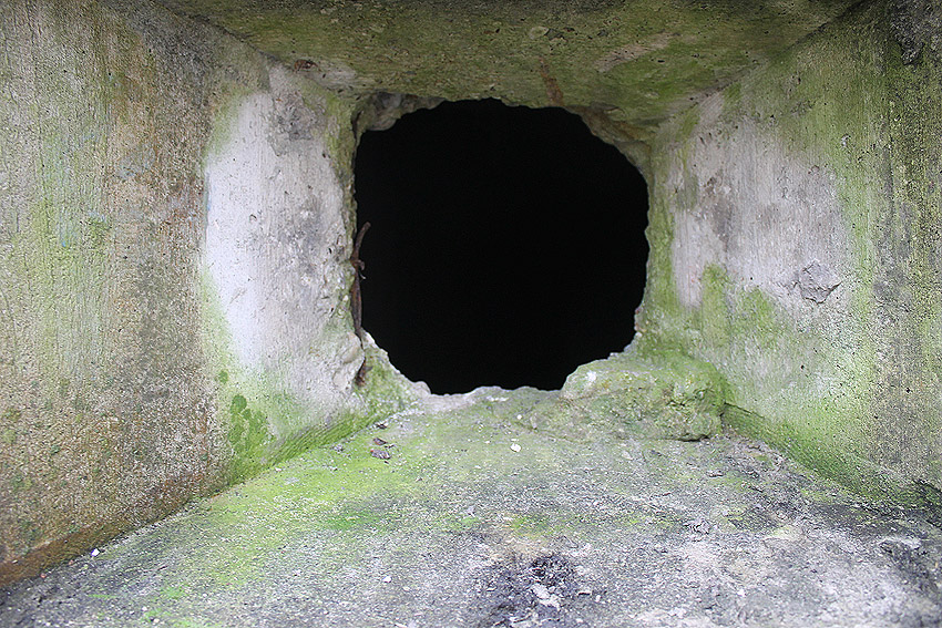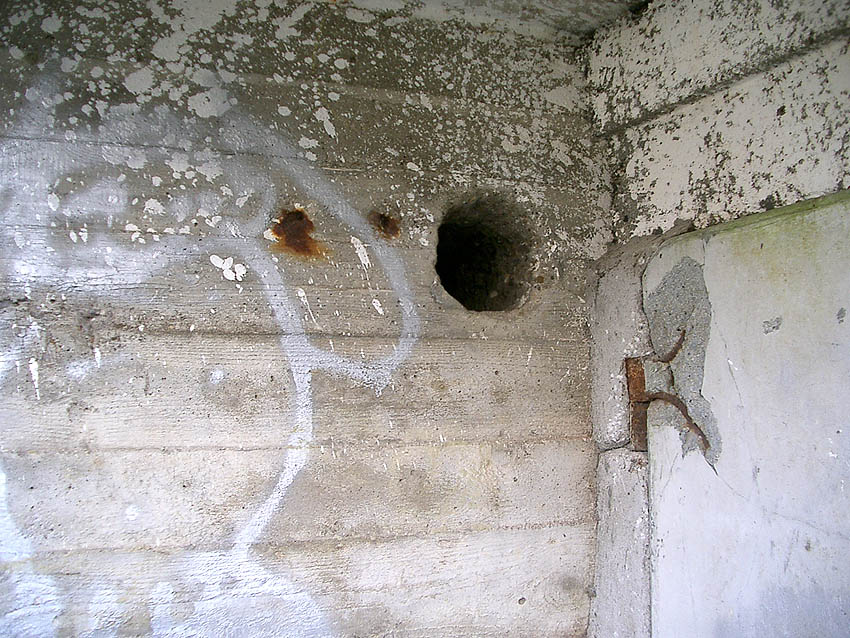 Die Öffnung an der Nordseite des Bunkers schien eine Art Sichtscharte gewesen zu sein. Sie wurde in den Jahren im Innenbereich wahrscheinlich weiter aufgebrochen und befindet sich im Gasschleusenbereich...