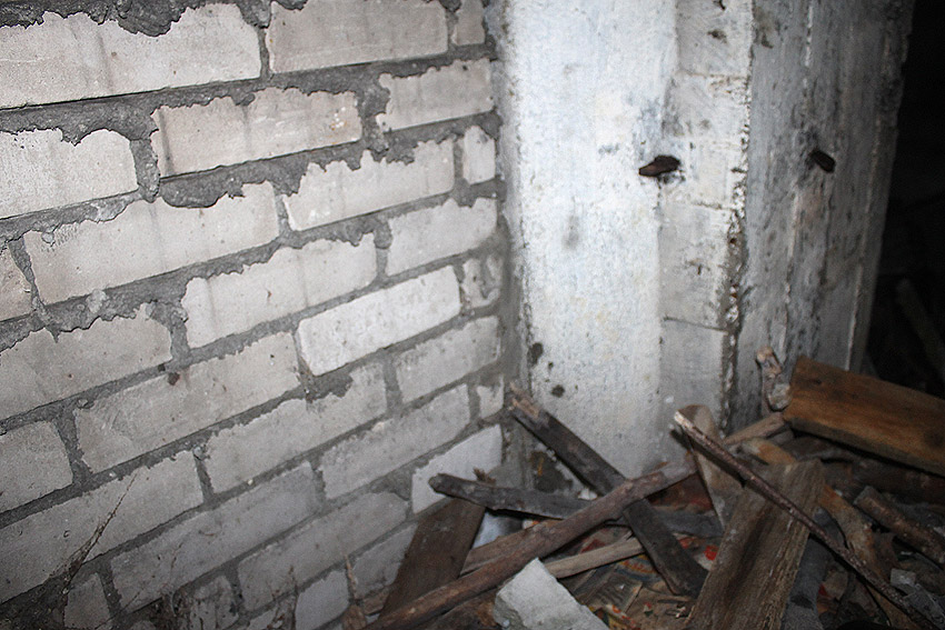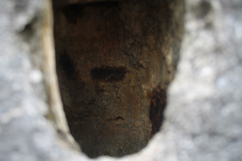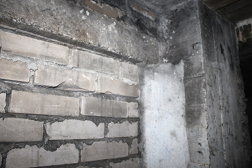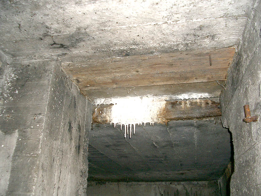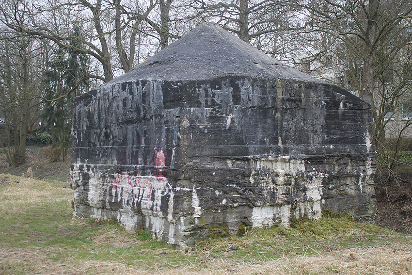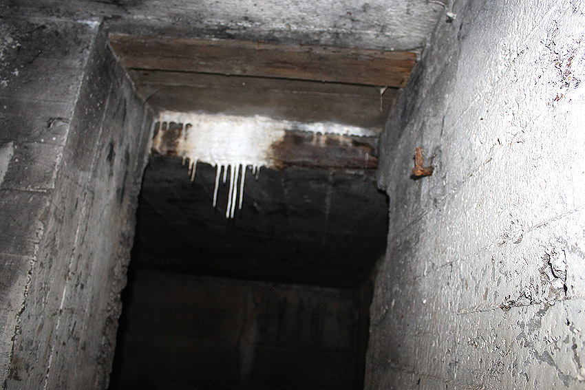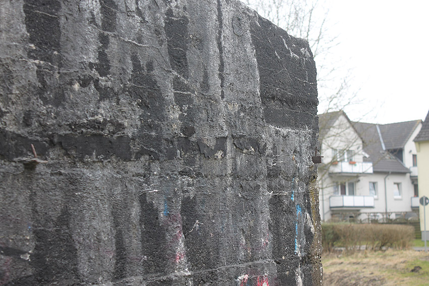 Hier war ein mutmaßlich verbunkerter Anbau in Röhrenbauform angesetzt. Links zu sehen ein runde Aussparung am Bunker in vertikaler Richtung. Dort könnte ursprünglich eine Art Rohr positioniert gewesen sein...