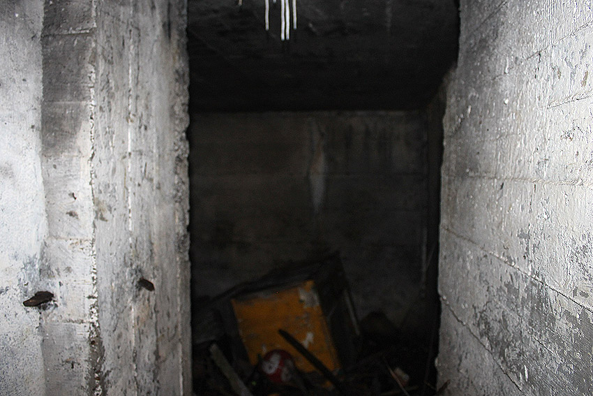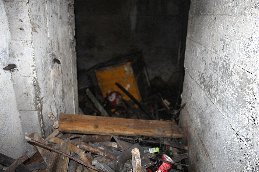 Blick durch die Gasschleuse, dahinter der Hauptraum mit Jahrzehnte altem Unrat. Rechts sind die Scharniere der inneren Schutztür zu sehen...