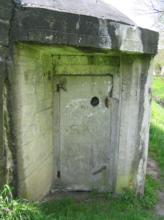 Diese Tür befand sich ursprünglich sehr wahrscheinlich im Inneren. Sie scheint aus einer Art "Gipsbetonmischung" zu bestehen. Sie diente wohl als innere Gasschleusenschutztür. Dass sie die ursprüngliche äußere Tür ist, gilt als unwahrscheinlich. Es kann natürlich trotzdem sein, dass dies die Original-Außentür ist. Nun jedoch dient sie als Blende für die Vermauerung... In späten Kriegstagen wurden Schutztüren öfter nicht mehr aus Metall gefertigt, sondern aus Ersatzstoffen. Metalle waren knapp und wurden für die kriegswichtigsten Vorhaben verwendet...