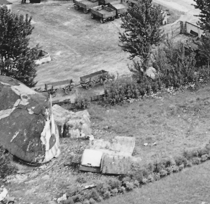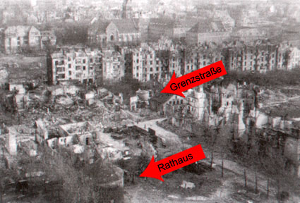 Der Bürgermeisterbunker ist hier direkt links unter der 2, welche auf einen der drei Mauerwerk-Kleintürme hinweist, zu sehen. Mit den Standorten der drei Kleintürme bildete der Bürgermeisterbunker aus der Luft ein verzerrtes "Bunkerrechteck".
