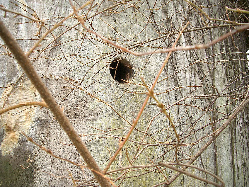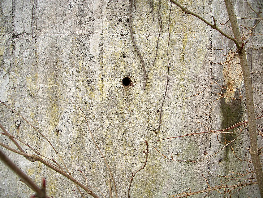 Auch der Notausgangsblock dieses Bunkers besitzt zwei Zughaken (Lastenheber sollten im Notfall den Block herausziehen), schemenhaft im Gewächs zu erkennen...