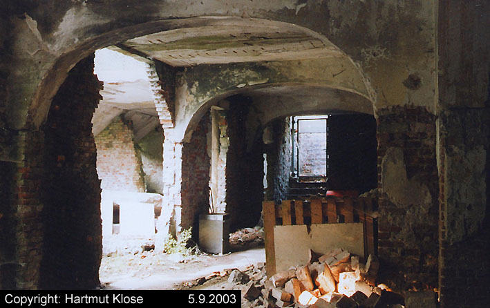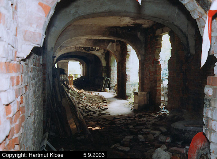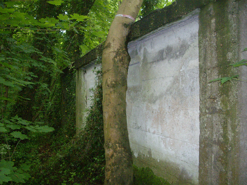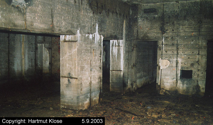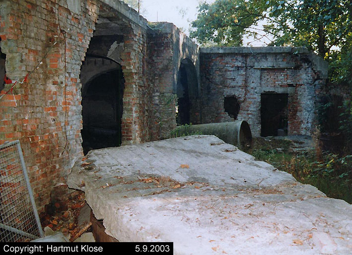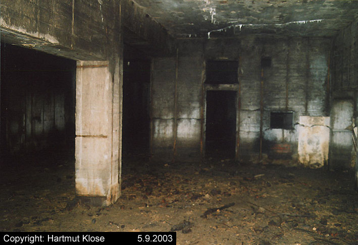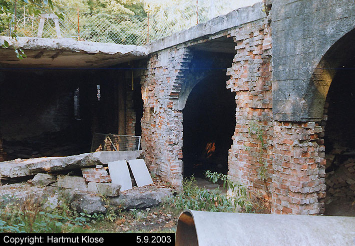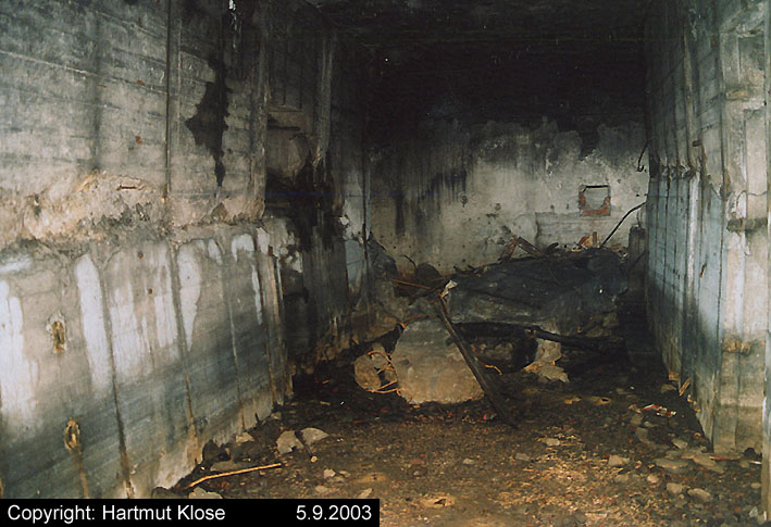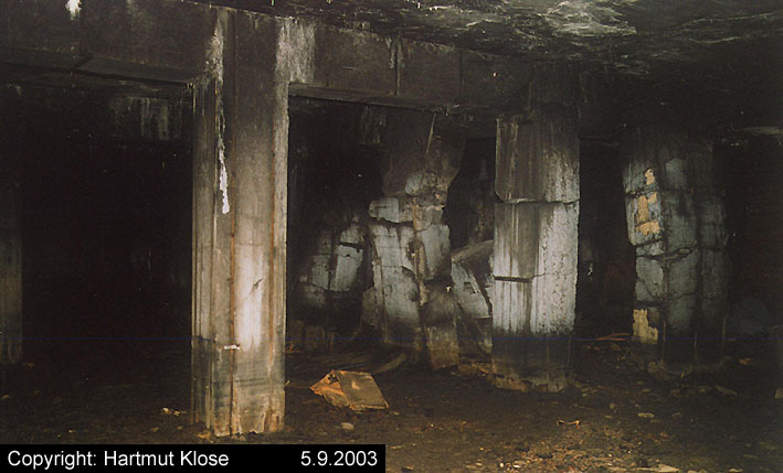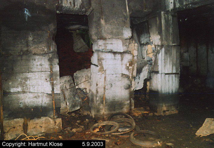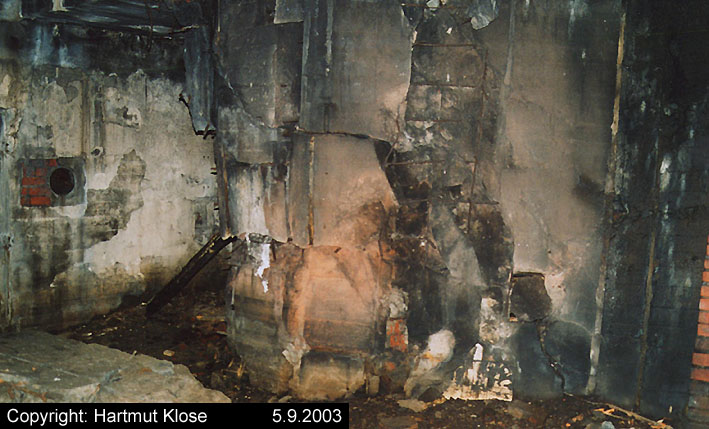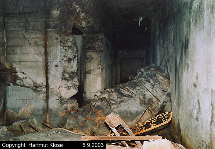 Der gesprengte Bereich an der Westfassade. Hier befand sich ursprünglich ein Anbau mit Beobachterturm und leichter Flakstellung...