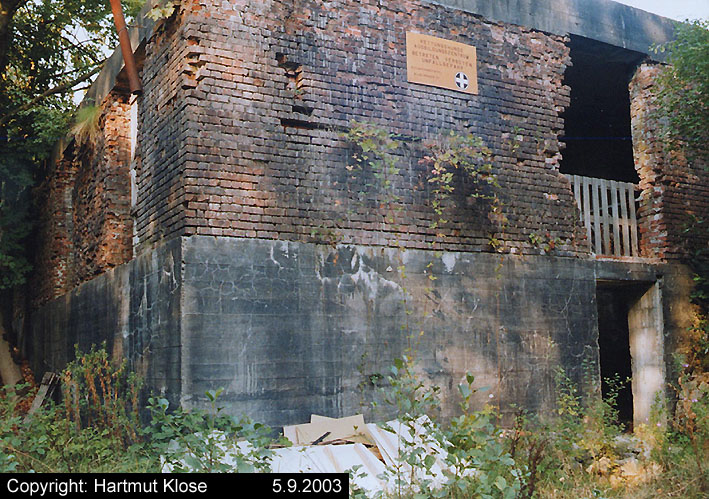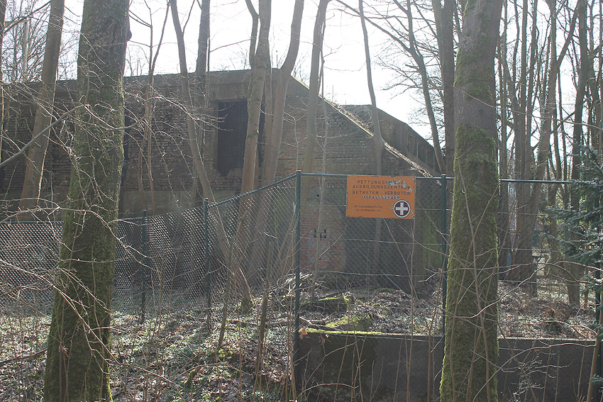 Eines der Leitstandnebengebäude im Stadtpark. Ursprünglich waren drei Gebäude dieser massiven Art und mehrere dazwischenliegende Baracken im östlichen Bereich des Geländes vorhanden, heute existiert nur noch dieses eine Bauwerk, die beiden anderen wurden in den 1990er Jahren entfernt: