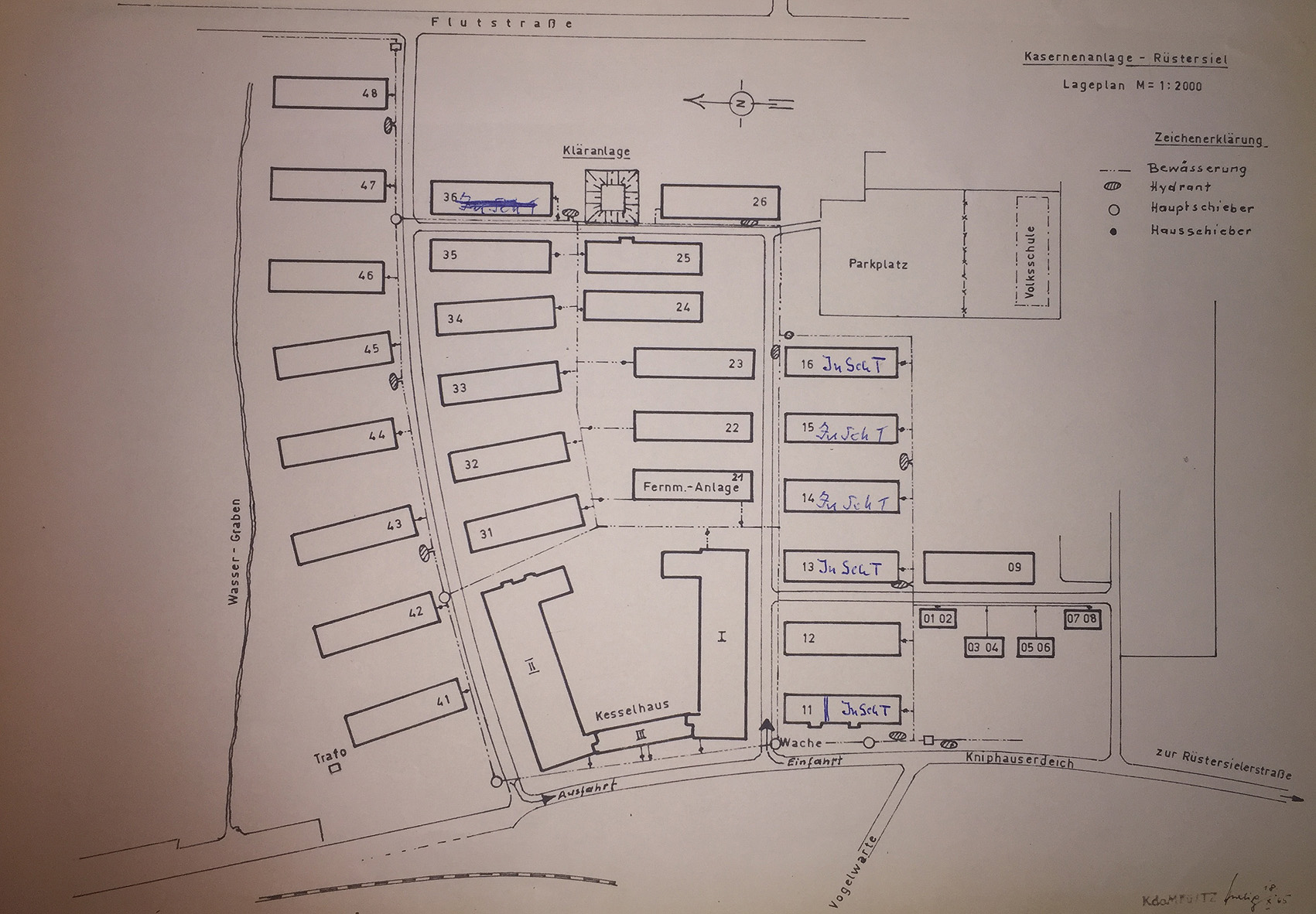 Der Tiefbunker befand sich unter einem Gebäude des ehemaligen Marinedurchgangslagers, dem späteren Hochschuldorf. Es gab zwei Eingänge, einen an der Westflanke des Bunkers am späteren Schlengenweg und einen an der Ostflanke des Bunkers. Sie waren äußerlich des Gebäudeüberbaues angelegt. Ob es einen dritten Eingang direkt vom Gebäude aus gab, ist ungewiss. Der Bunker wurde in der Nachkriegszeit von der Bundeswehr weiter als Schutzraum genutzt.