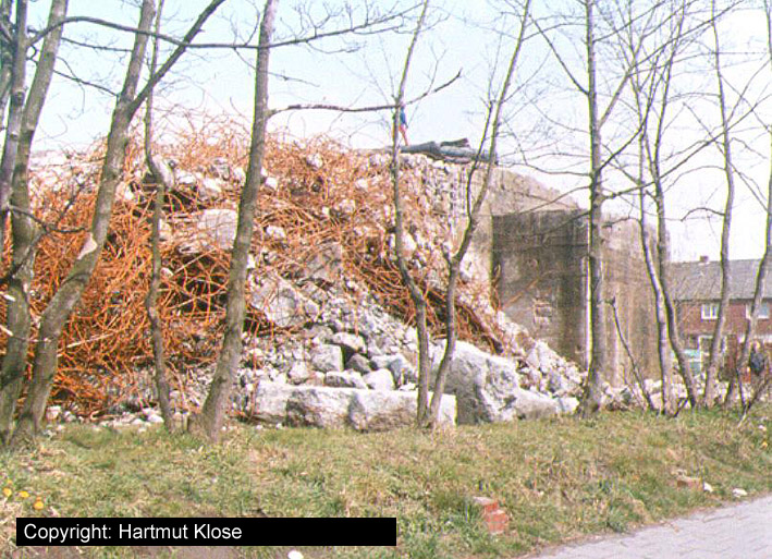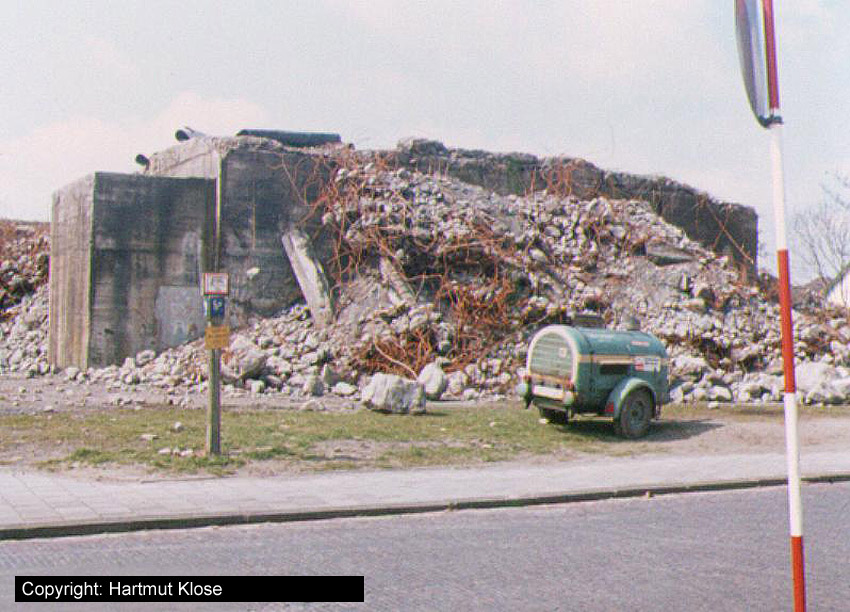 Anfang der 1970er Jahre wurden die Eingänge zugemauert. Ebenfalls Anfang der 1970er Jahre, wohl 1973, wurde der Bunker gänzlich entfernt. An einer Seite des Bunkers war eine bisher undefinierbare rautenähnliche Metallhalterung mit den Maßen: circa 50 cm x 30 cm, angebracht. Dieses Objekt könnte eventuell eine Art Luftschachtblende dargestellt haben.