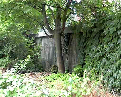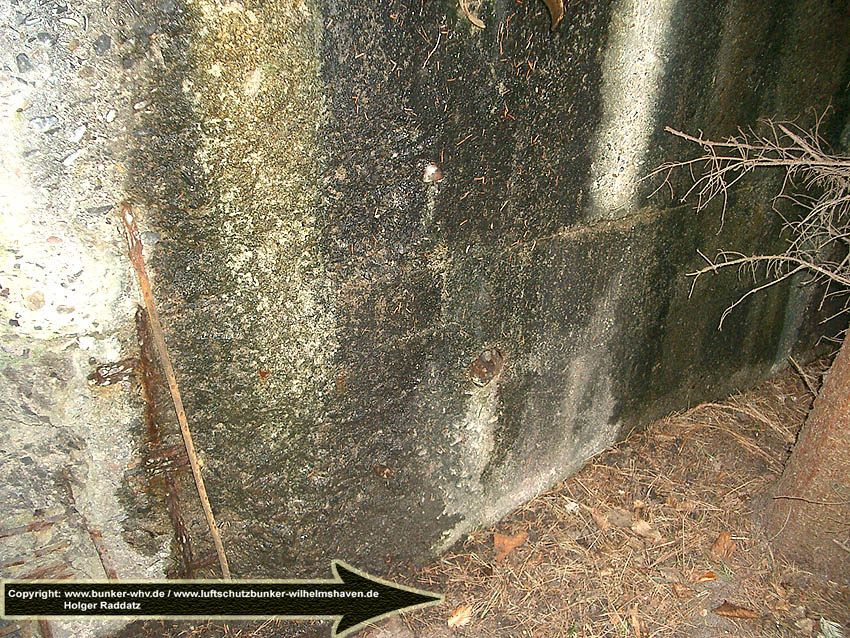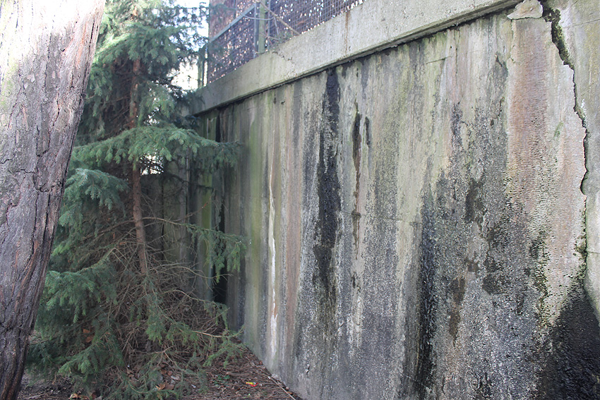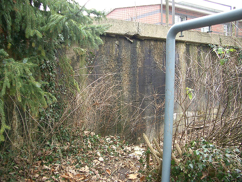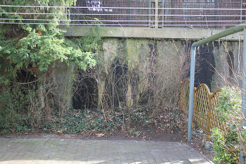 Die weisse Wand links gehört zum unmittelbar neben dem Bunker befindlichen umgebauten Hochbunker Rheinstraße 114.