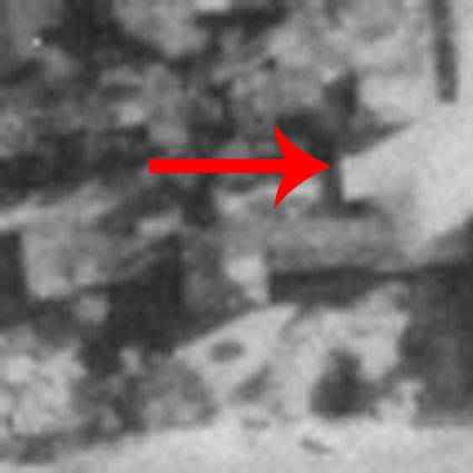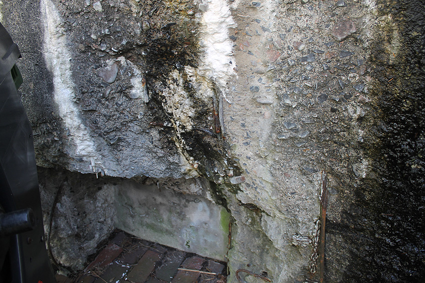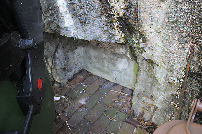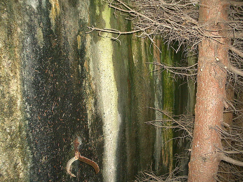Rings um den versiegelten Öffnungsbereich sind mehrere "Löcher" vorhanden. Links davon auch ein größerer Schacht (Luftschacht). Die kleineren "Löcher" könnten für die Platzierung von Sprengmaterial eingebohrt worden sein. Sollte hier massiv gesprengt werden? Sollte eventuell nach dem Krieg ein größerer Zugang geschaffen werden?