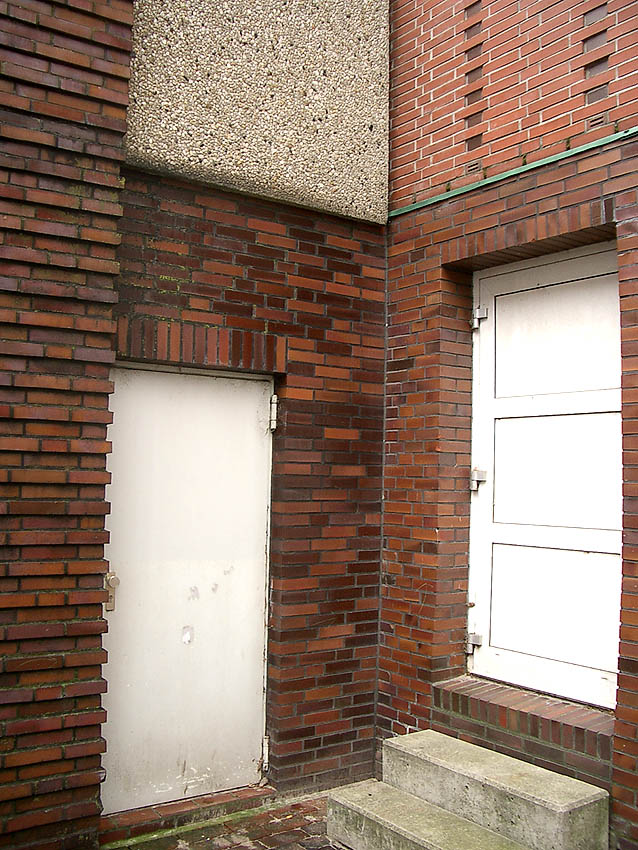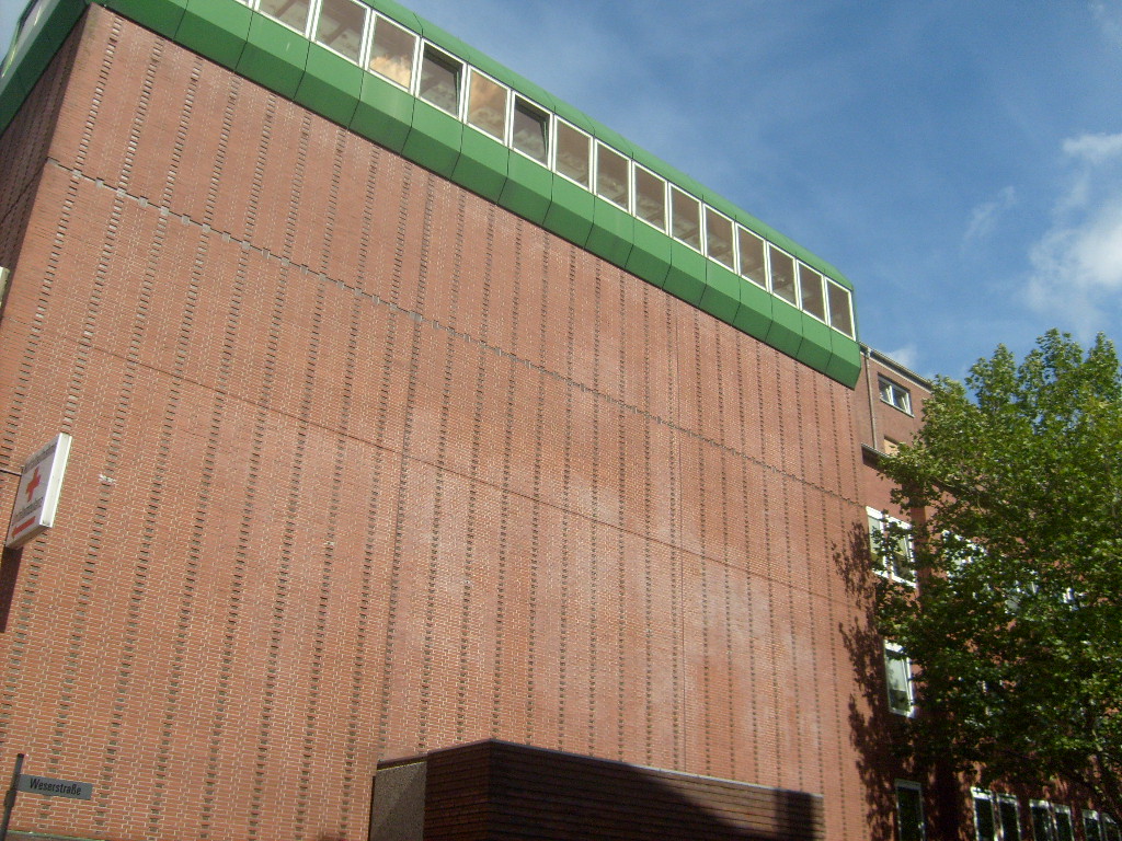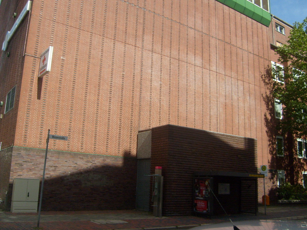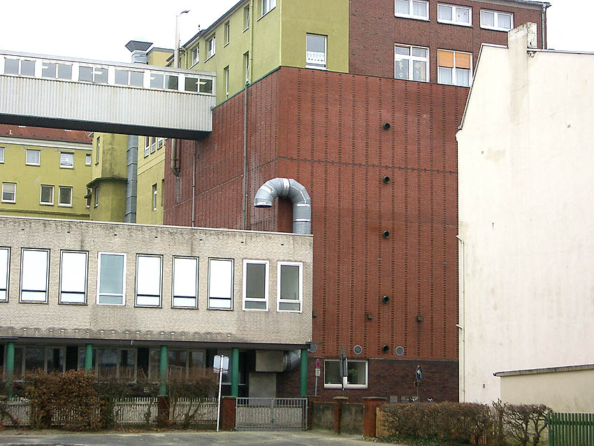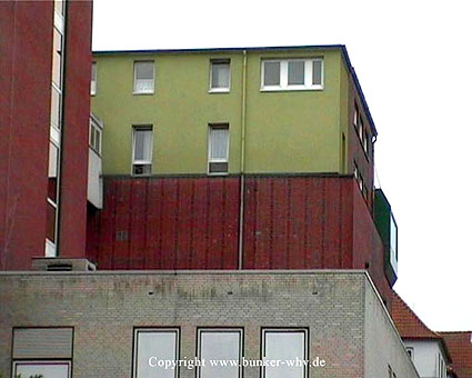 Der rückwärtige alte Krankenhausbau an der Weserstraße war seit Bau des Bunkers an dessen Ostwand mit ihm verbunden. Dort sind schon ursprünglich Türen zwischen jeder Bunkeretage und Gebäudeetage geschaffen worden.