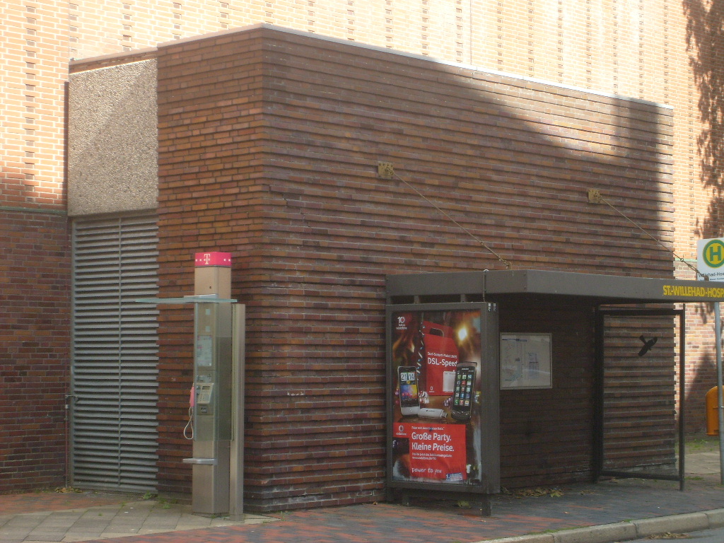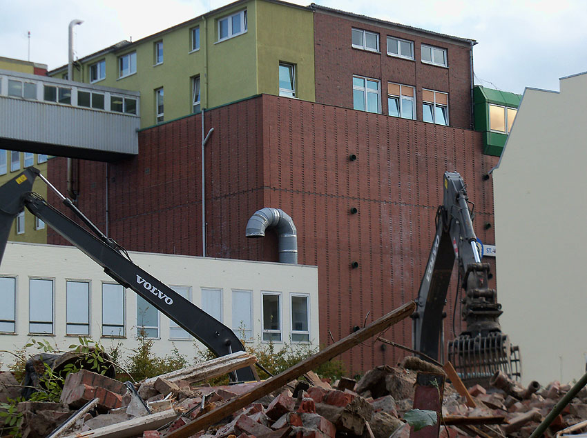 Nach einem Jahr Verzögerung wurde nun im Herbst 2011 (leider) die Ansgarischule abgebrochen. Am 26. Oktober um etwa 14.20 Uhr fiel die letzte Wand. Nun herrscht erstmals aus dieser Sichtschiene freier Blick auf den OP-Bunker: