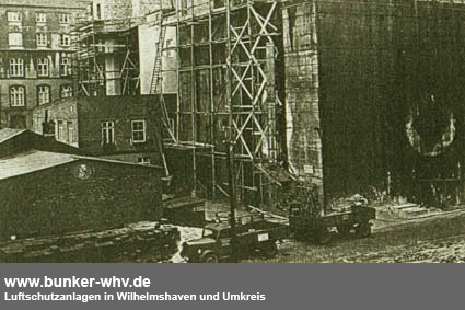 1950er Jahre / angeordnete Entfestigung oder (was aufgrund des Aufnahmedatums viel wahrscheinlicher ist) bereits speziell die Öffnung des Bunkers für den späteren Anbau / Neubau (das Foto wurde aus dem Dachboden der Ansgarischule aufgenommen). Ersichtlich ist, dass die Nordseite am Baugerüst in allen Geschossen entfestigt wurde. In der obersten Etage, sowie im Erdgeschoss und der ersten Etage entstanden später Türen zum Neubau. Der Rest der Entfestigungsschnitte wurde wieder verschlossen. Ob der Bunker einen Lüftungsturm besaß oder noch besitzt, ist unklar. Der Bunker hat jedoch einen aufgesetzten Beobachtungsstand besessen. Dieser wurde schon vor Fertigstellung des Bauwerkes auf dem angrenzenden Altbau des Krankenhauses errichtet. Durch das Gewicht war jedoch die Gebäudestatik gefährdet. Sofort nach Fertigstellung des Hochbunkers wurde der Stand daraufhin auf das nun nebenan liegende Bunkerdach umgesetzt. Auf dem oberen 1945er Luftbild ist leider nichts von einem Beobachtungsstand oder einem Lüftungsturm zu erkennen. Es liegt uns jedoch ein weiteres, eher aufgenommenes Luftbild vor, das eindeutig den Schattenwurf eines Objektes auf dem Bunkerdach zeigt: