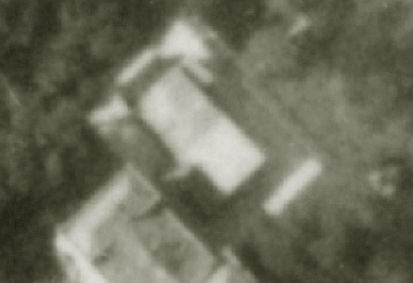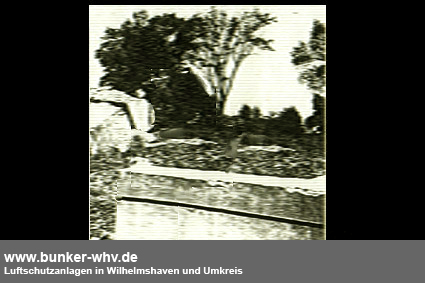 Zu erkennen sind zwei splittergeschützte Eingänge am Bunker, in ähnlicher Anordnung wie beim Bunker Schellingstraße. Eindeutig zu erkennen ist auch die Zerschellerplatte. Darüber zu sehen ein mutmaßlicher quadratischer Feuerlöschteich.