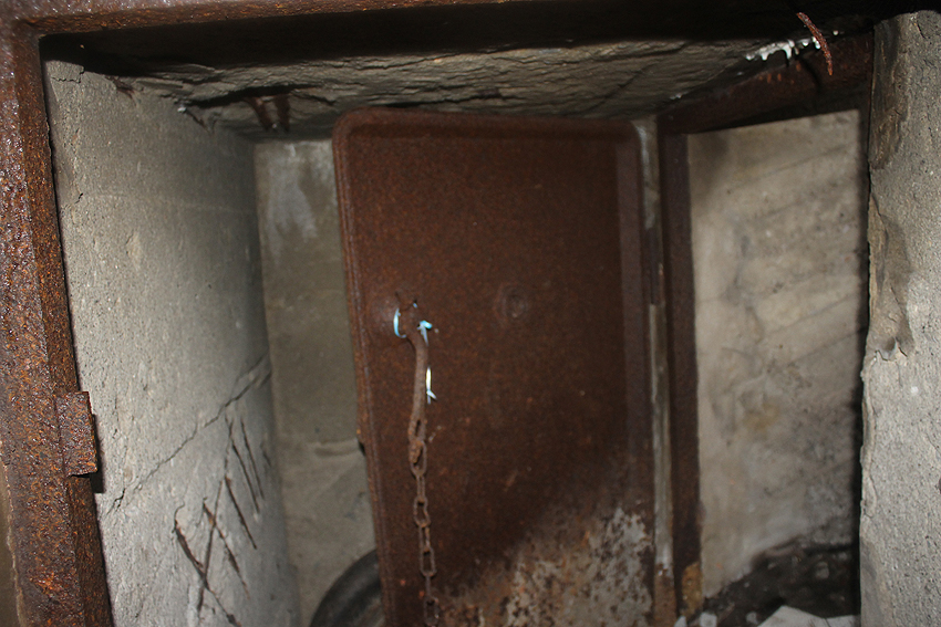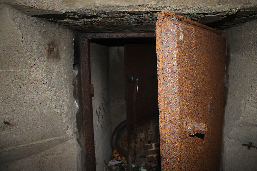 Anfang 2016 war der Bunker zeitweise zugänglich. Interessant ist die saubere Schalung im Inneren, besonders die zehneckige innere Kuppelschalung, das Luftrohr genau mittig in der Kuppel, die beiden LS-Türen und der Notausstieg.