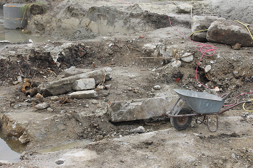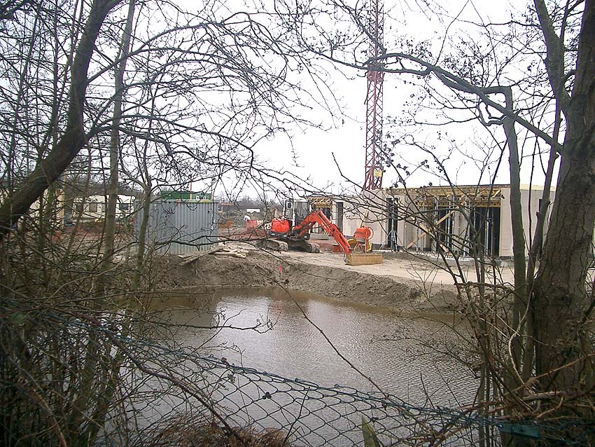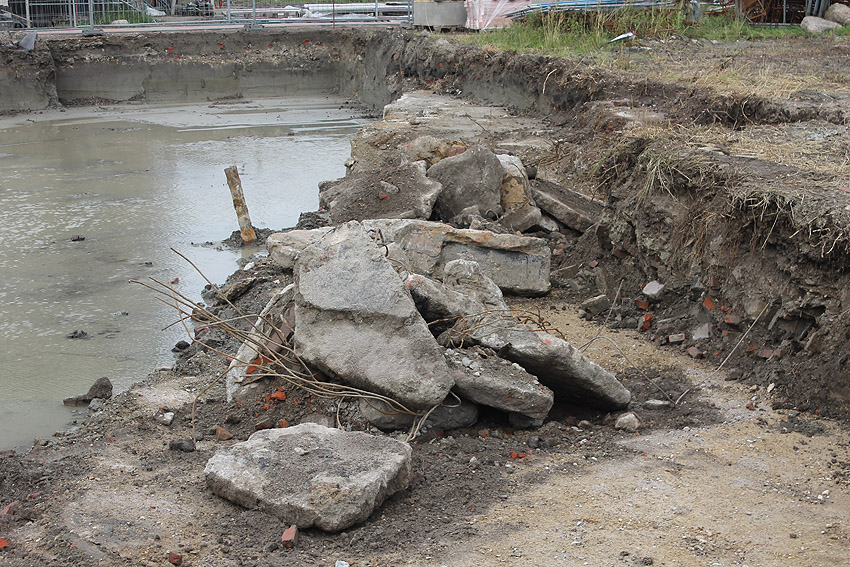 Die Betonstrukturen im Baustellenbereich sind größtenteils beseitigt worden. Weitere Strukturen als die ersichtlichen sind nicht mehr ans Tageslicht getreten. Nun erfolgt die Tiefgründung des Neubaues.