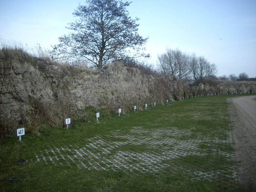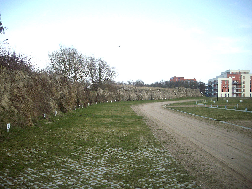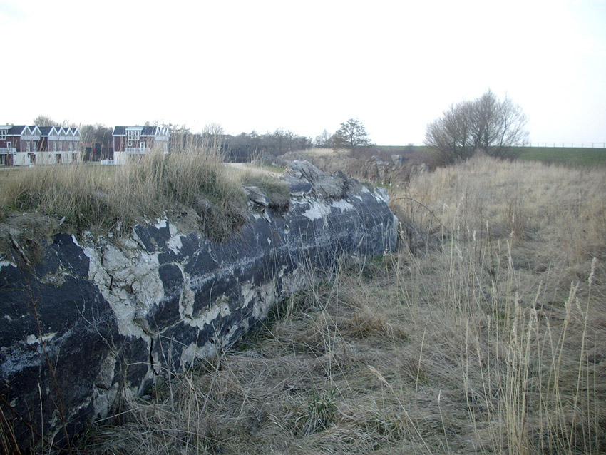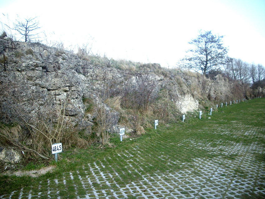 Nun sind die gesamten Reste der Nordflanke der ehemaligen Verbunkerungen klar erkennbar. Diese bleiben weiterhin erhalten und stellen nun eine Art künstliche Klippe dar. Die gewaltige Betonfront erstreckt sich von Westen nach Osten über fast 250 Meter hinweg...