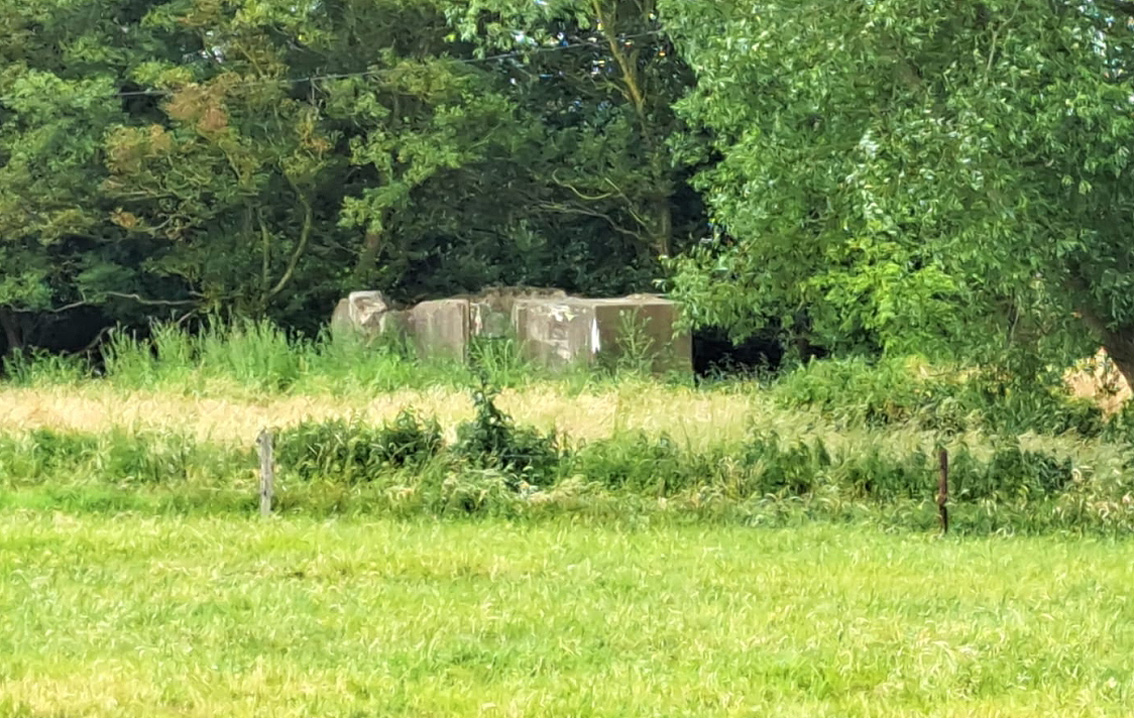 Mindestens zwei betonierte Geschützbettungen für 8,8 cm Flak (Nord / Süd) im (wohl) gesprengten Zustand sind noch vorhanden, hier zu sehen die südliche Bettung.