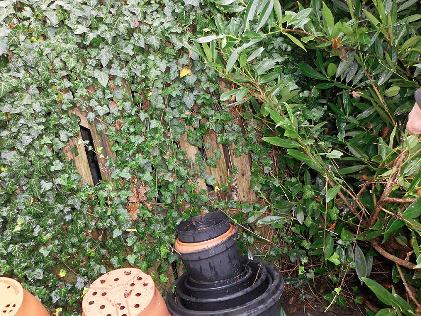 Der Schutzraum liegt völlig versteckt unter Bepflanzung und Sträuchern. Die Druckschutztür im Inneren ist nicht mehr vorhanden.