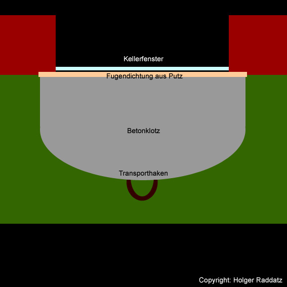 Vor vielen LS-Kellerfenstern im Stadtgebiet wurden Betonblöcke als Detonationsdruckschutz abgelagert. Der Zwischenraum zwischen Block und Außenwand wurde mit Putz abgedichtet.
