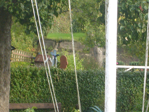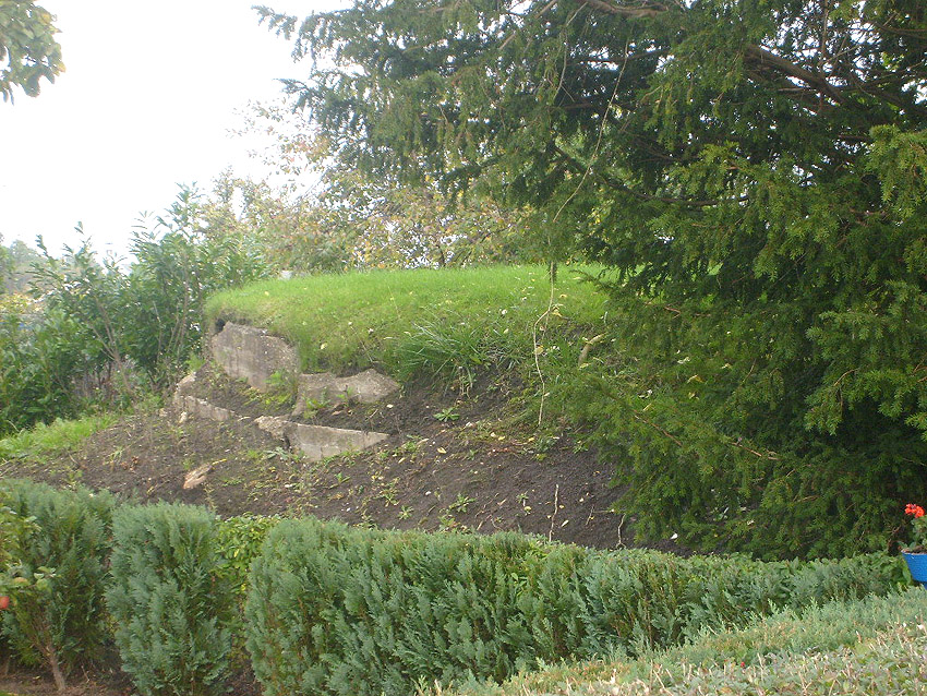 Oben: Wenige Reste des Munitionsbunkers in einem heutigen Garten. Die ersichtlichen Betonstücke wurden zu einer dekorativen Säule zusammengesetzt.