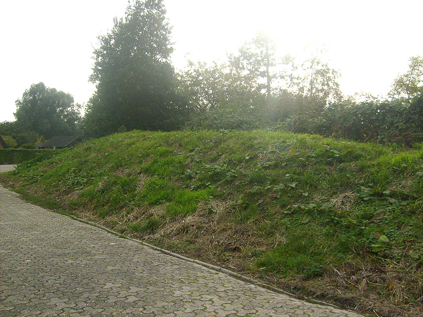 Oben: Reste Geschützbunker Süd-West. Südwestlich daneben zugehörig zum Geschützbunker ein kleiner Munitionslagerbunker. Circa 8 Meter (auf Betrachterhöhe der Aufnahme des zweiten Bildes von 2005) links des Weges befand sich fast mittig zu den vier Geschützbunkern der vollständig beseitigte Leitbunker...
