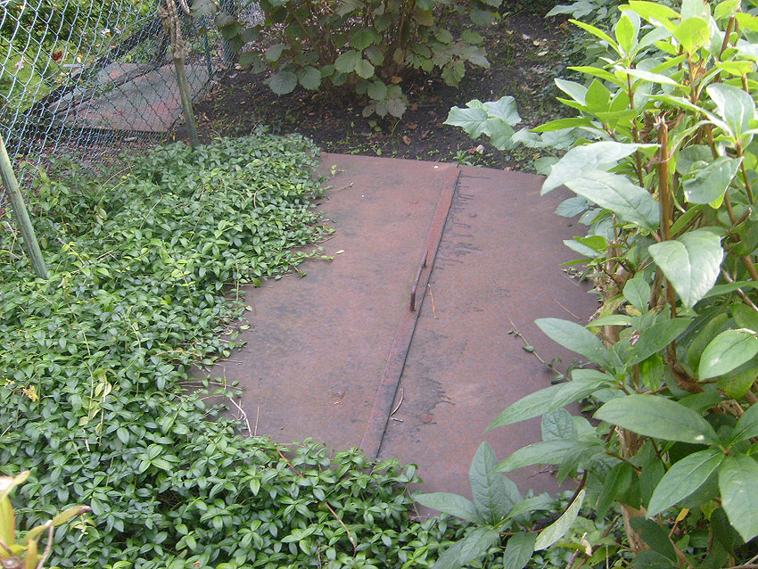 Oben: Stahlklappe im Boden direkt östlich des Maschinenbunkers