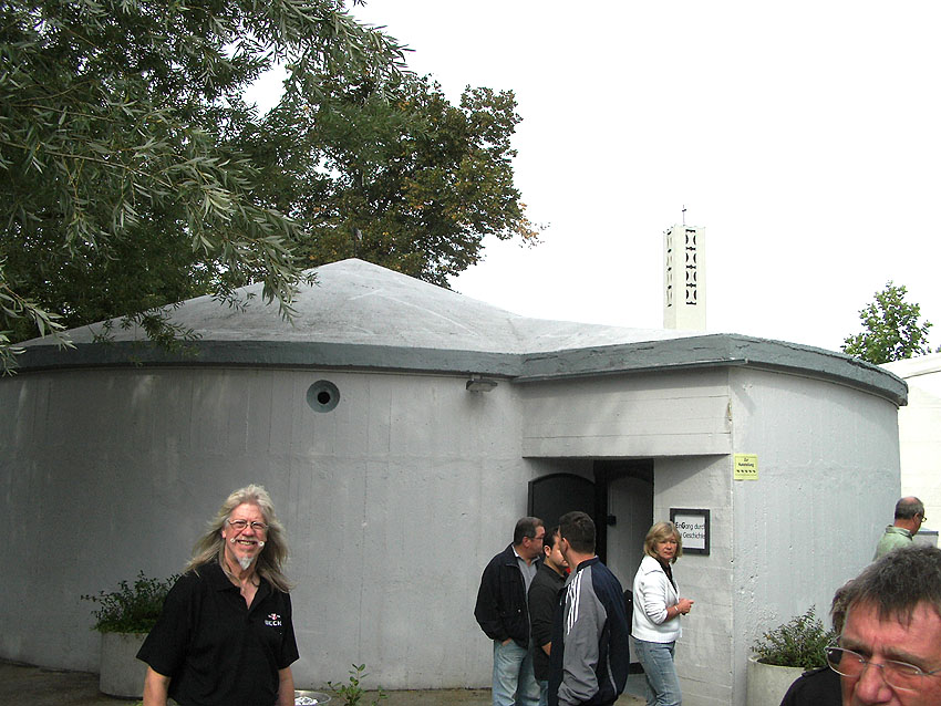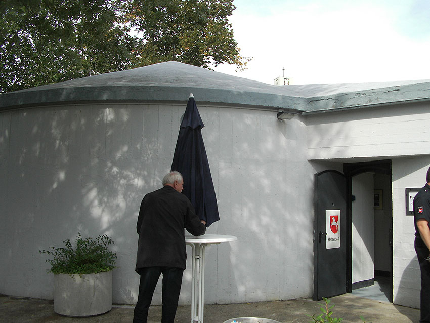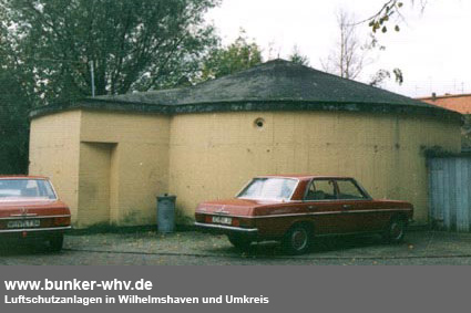 Bemerkenswert ist, dass dieser massive Rundbunker über eine kreisrunde, umlaufende Zerschellerplatte verfügt, ähnlich wie jene der großen runden Luftschutztürme Wilhelmshavens...
