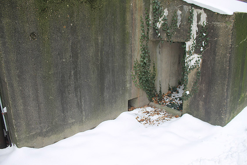 Folgende zwei Bilder: Zumindest vor diesen beiden Kellerfenstern befanden sich zwei Splitterschutzvorbauten wie an der Südseite. Zu erkennen noch Verfugungsmaterialreste und hellere Bereiche der Wand. Die Vorbauten wurden lediglich an die Mauer gesetzt und hatten keinen massiven Verbund zum Gebäude: