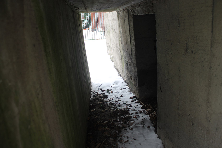 Dies ist das heute noch vorhandene Zwölftel der verbunkerten Eingänge (sie wurden auch als Notausgänge genutzt). Die Eingänge befinden sich im Südostbereich der ehemaligen Torpedokaserne nahe des dortigen LS-Turmes. Eine andere Quelle besagt, dass hier schon der äußerste Westbereich der Roonkaserne anliegt.