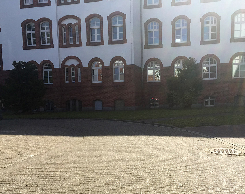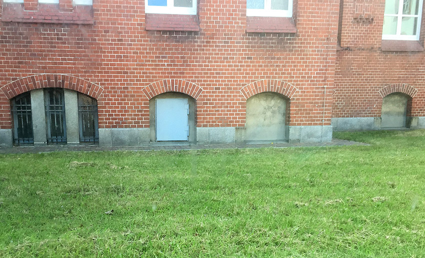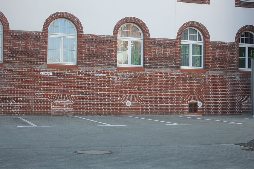 Im Hof an der Nordseite des Gebäudes sind noch immer gemauerte Versiegelungen von Kellerfenstern vorhanden. Diese wurden während der Renovierung der Anlage aufgrund des Denkmalschutzes nicht verändert, lediglich sandgestrahlt, die Fugen teilweise neu verputzt und wie unten ersichtlich mit Lufteinlässen versehen. Hier hinter waren LS-Kellerbereiche. An den Gebäuden der ehemaligen Kaserne Mühlenweg beispielsweise sind auch noch solche Vermauerungen der Kellerfenster vorhanden. Diese wurden beim Neubau des NGW in dem Bereich ebenfalls belassen.