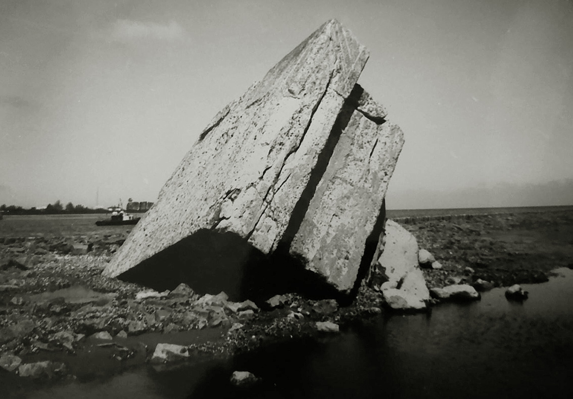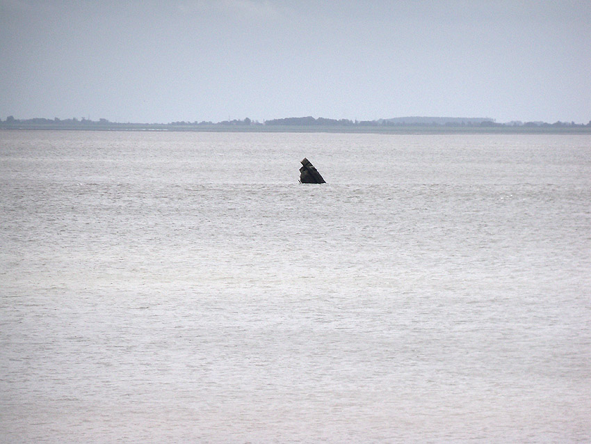 Am Pfeil rechts das "Krüger-Denkmal" im Krieg / April 1945 mit gut erkennbarer Schattenwirkung. Das Denkmal wurde interessanterweise auf einem identischen Betonsockel gebaut wie jene Sockel für leichte Flakgeschütze, Scheinwerfer und Nebeltonnen auf der Dammlinie in südwestlicher, südlicher und südöstlicher Fortsetzung Richtung Arngast. Hier im Bild sind 9 davon zu erkennen. Das Luftbild wurde bei Hochwasser aufgenommen. Die größere 15. Verbunkerung mit deutlicher Schattenwirkung befindet sich hier nahe über Sockel 2 von der unteren Bildkante aus gesehen.