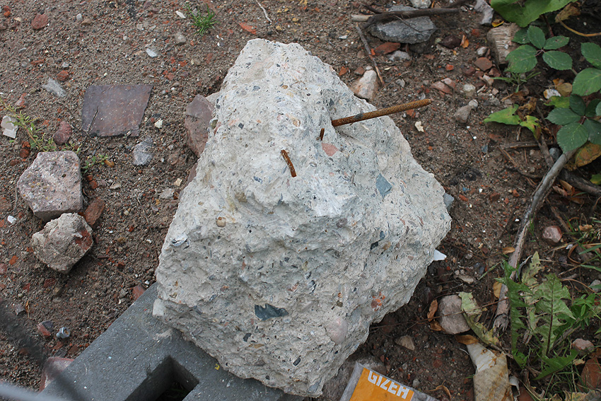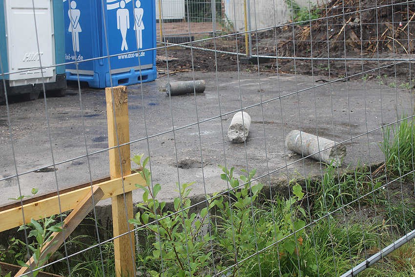 Stand 05.09.17 (!): Die Fundamentplattenbeseitigung war zunächst bis Mitte 2017 vorgesehen gewesen, das Beseitigungszeitfenster ist nun wieder unklar. Im mittlerweile immer mehr zuwuchernden Gelände ist die Platte noch immer vorhanden. Wir berichten weiter.
