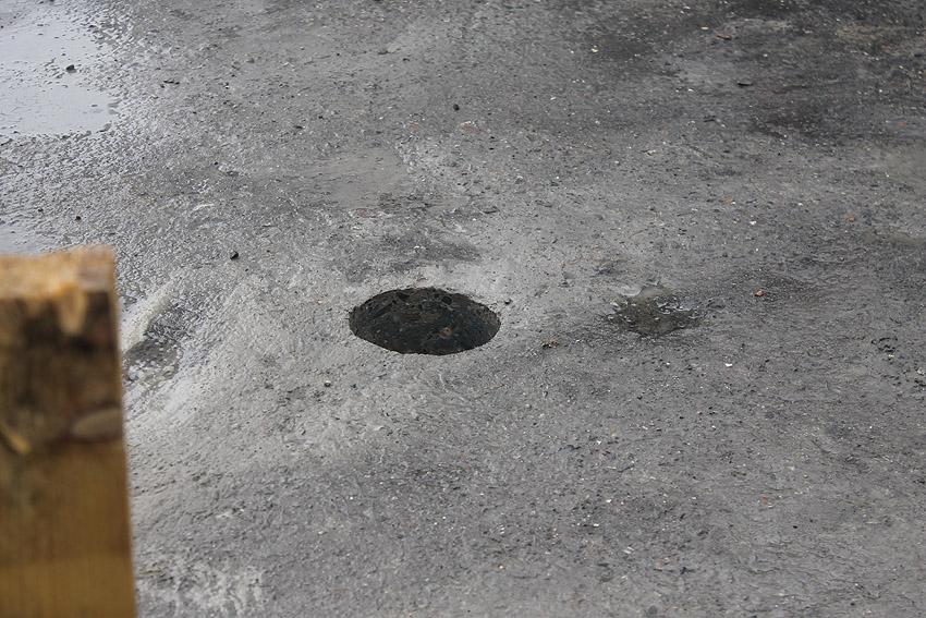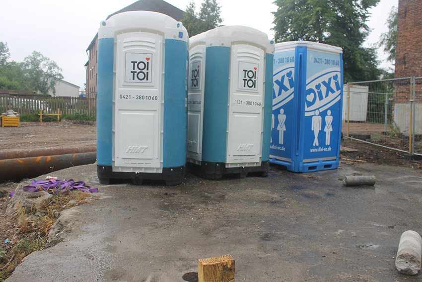 Stand 25.05.18: Die Neubauaktivität auf dem Gelände hat in den letzten Tagen nun (endlich) begonnen. Die Bunkerplatte dient jetzt als Fundament für Klohäuschen. Eine Kernbohrung wurde gesetzt. Drei Stücke dieser Bohrung liegen nun auf der Platte. Es ergibt sich eine Tiefe der Bodenplatte von etwas mehr als einem Meter. Der Abriss des Reliktes dürfte nicht mehr fern sein. Wir berichten weiter.