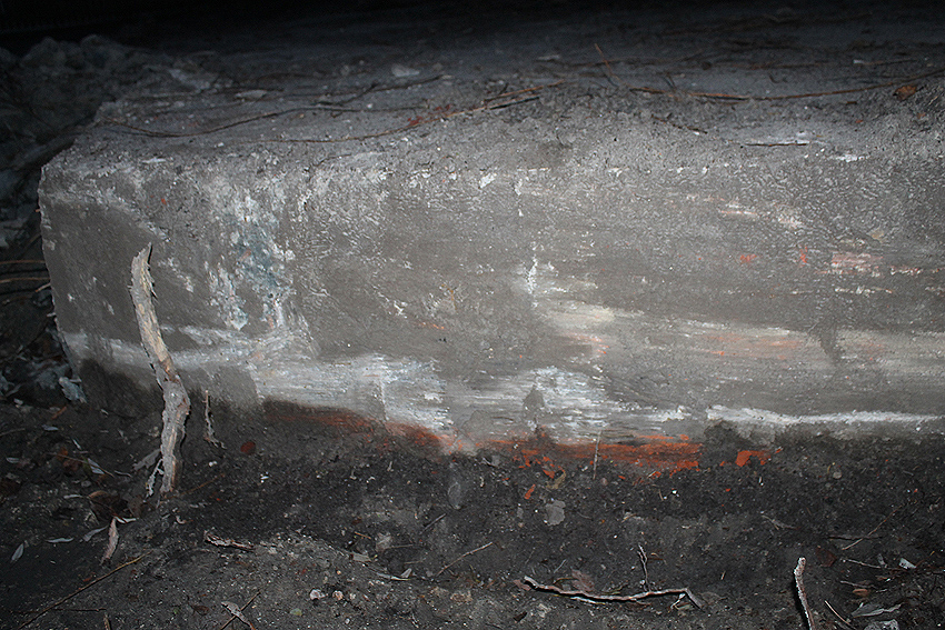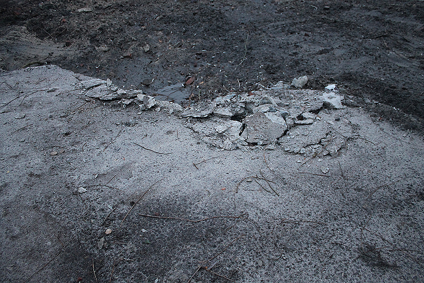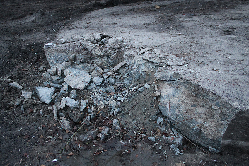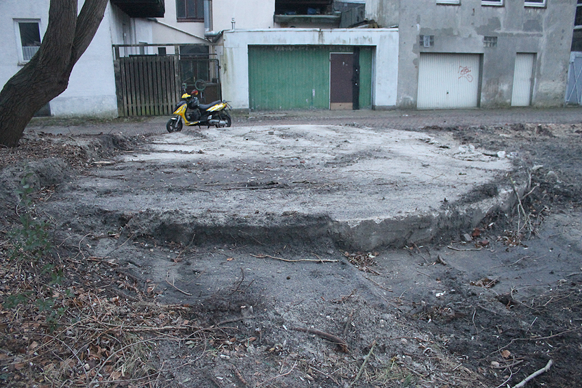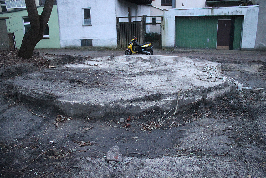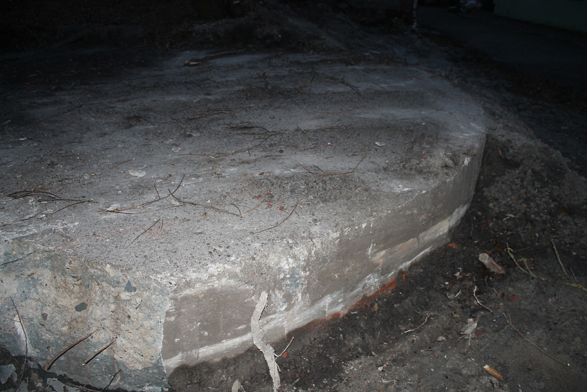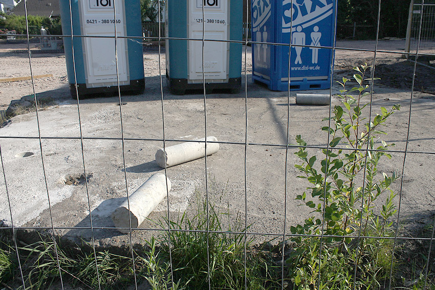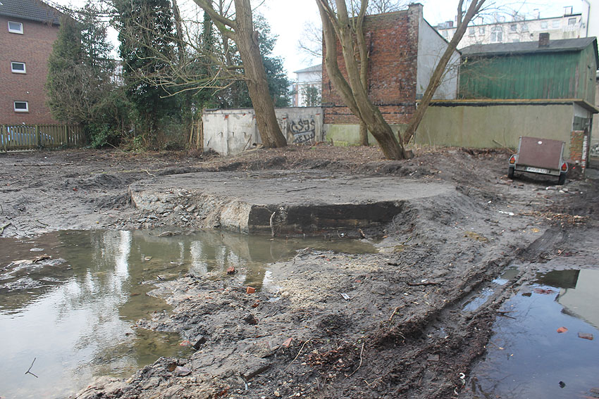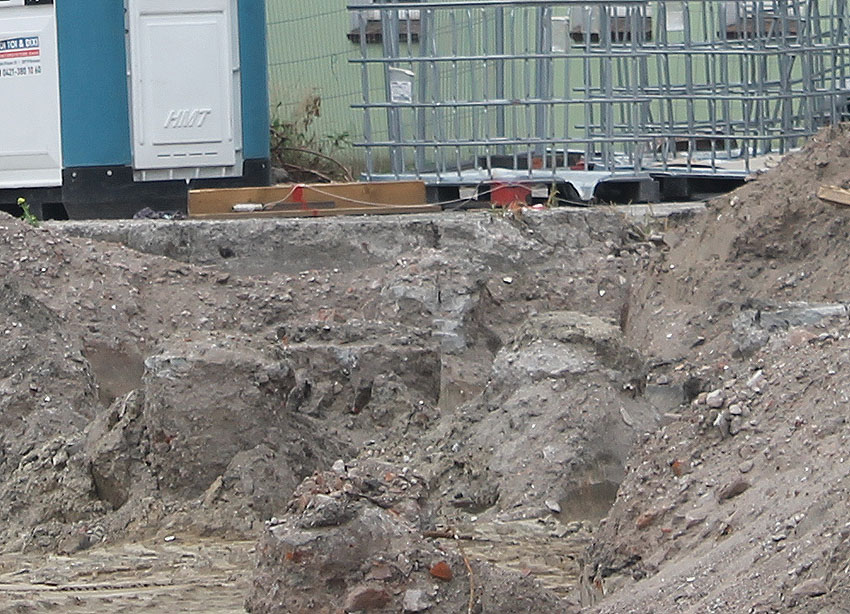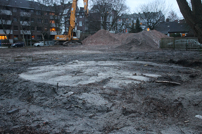 Abgerissen wurde jetzt wider Erwarten die Rundbunker-Fundamentplatte Allerstraße. Nachdem der Sockel des Neubaues bereits gefertigt war und keiner von uns mehr ernsthaft mit einem Abbruch der Platte rechnete, ist sie bedauerlicherweise nun zunächst in kleine Teile zerschnitten worden und wurde dann in "handlichen Bröckchen" abgefahren. Warum diese Maßnahme nicht vor den eigentlichen Bauarbeiten erfolgte, erst recht, da die Platte bereits ein kleines Stück für die Sockelecke des Neubaues abgefräst worden war, ist uns unverständlich. Ob noch Reste des Unterbereiches der Platte erhalten blieben, kann nicht gesagt werden, ist jedoch unwahrscheinlich.