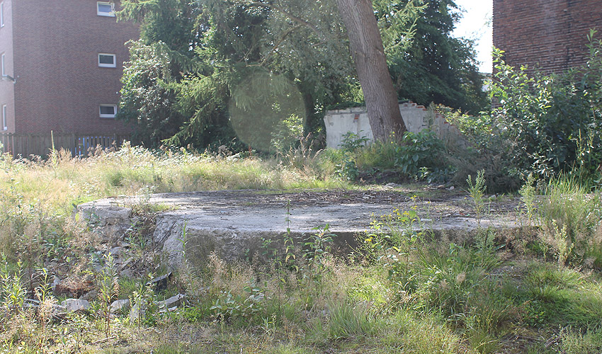 Wir haben nachgeschaut am 14. Oktober 2016: Auch ein Jahr nach dem Abriss der Schule keine Bauaktivität. Die Bodenplatte des ehemaligen Rundbunkers ist weiterhin vorhanden, das Grundstück verwildert immer mehr. So wie in der Montage wird der damalige Rundbunker in etwa ausgesehen haben...