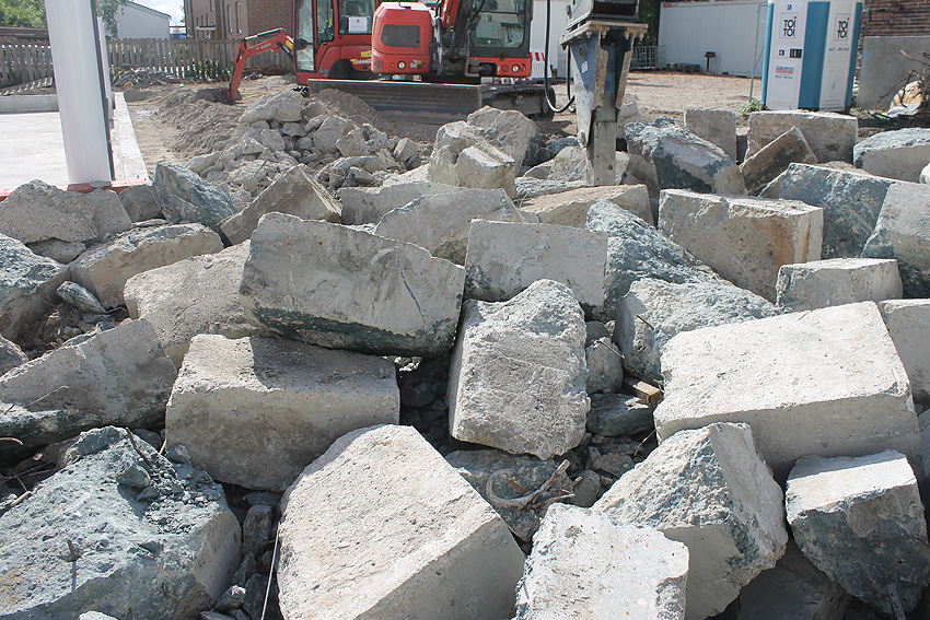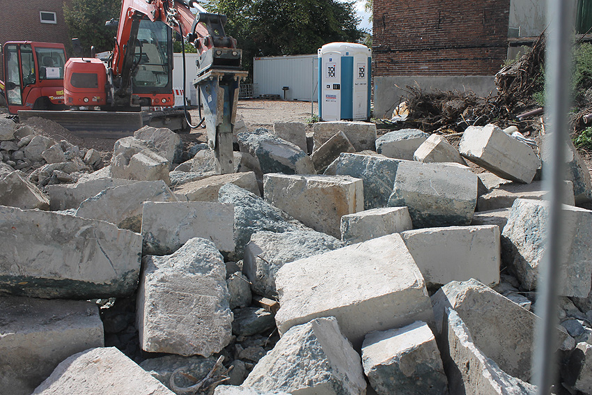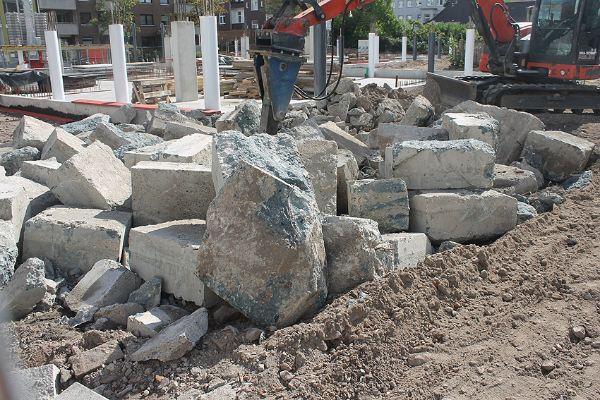 Stand 29.07.18: Wider Erwarten dürfte die Bunkerplatte glücklicherweise doch erhalten bleiben. Sie wurde lediglich im Südostbereich zusätzlich zu den damaligen Abbruchbereichen noch ein kleines Stück abgefräst. Der Neubau wird dort dann direkt an die Platte grenzen. Wir berichten weiter.