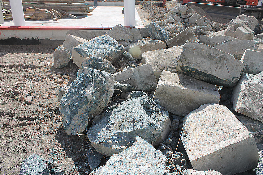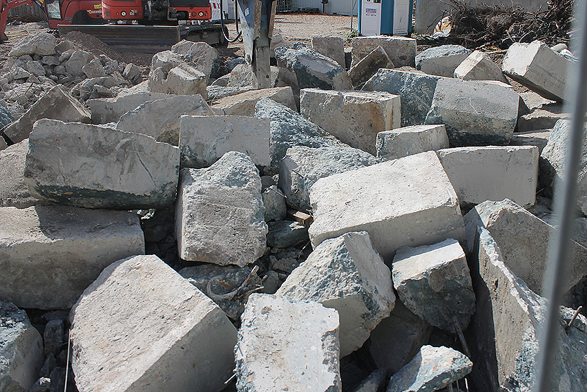 Stand 07.07.18: Die Bunkerplatte scheint eventuell in den Neubau mit einbezogen zu werden. Zu sehen ist ein mittlerweile abgebrochener kleiner Teilbereich an der Ostseite (blauer Beton...). Erkennbar nun auch auch gut die Tiefe der Platte von über einem Meter. Wir berichten weiter.