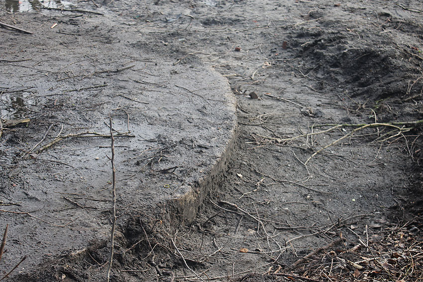 Stand 24.03.18: An der Allerstraße dient die Rundbunkerbodenplatte nun als Träger von Baumwurzelresten. Wir berichten weiter.