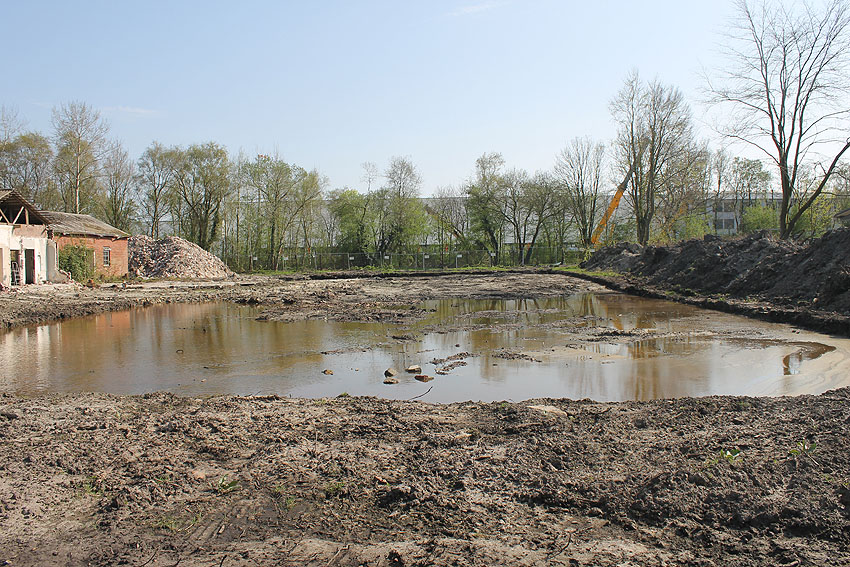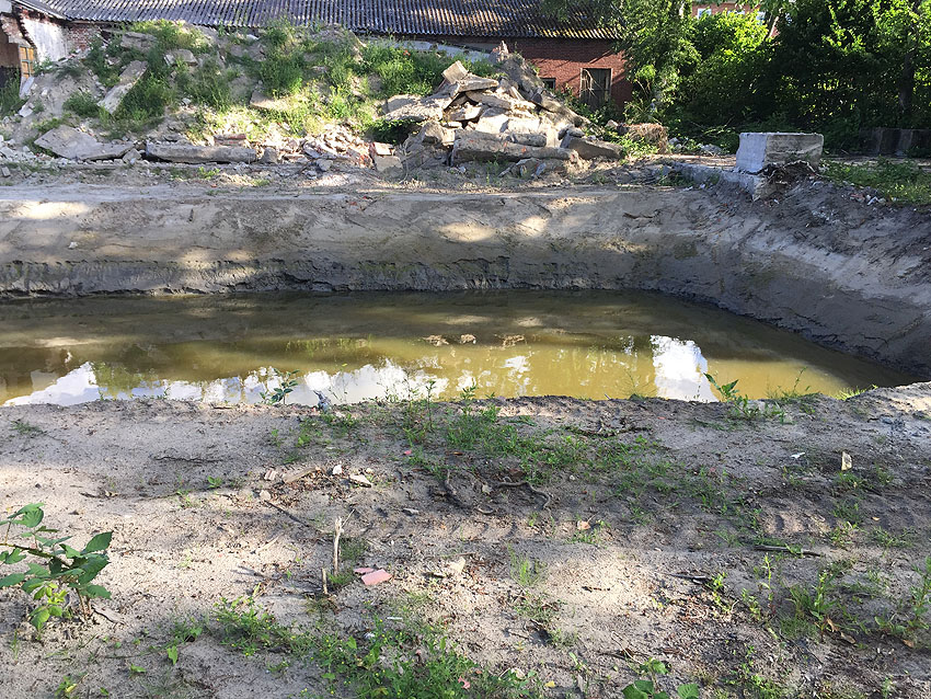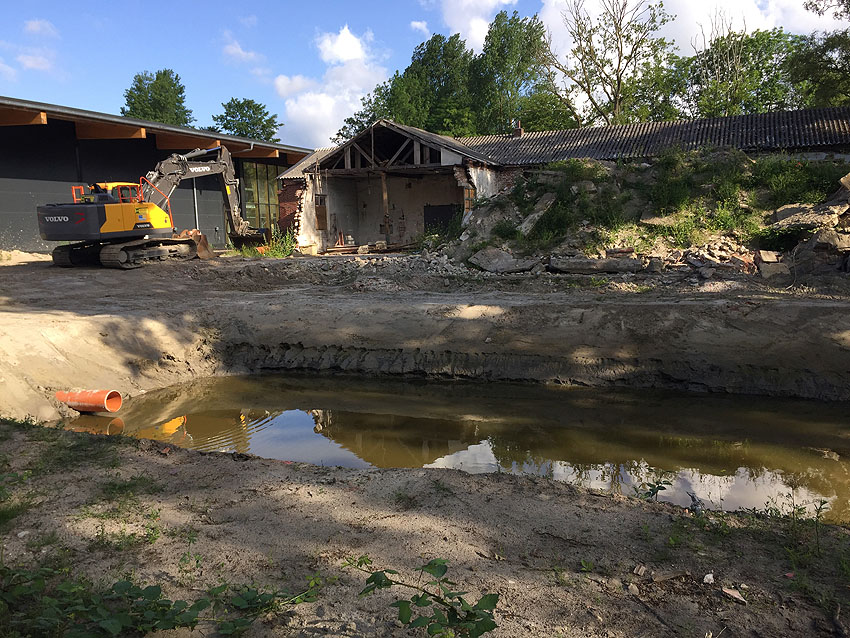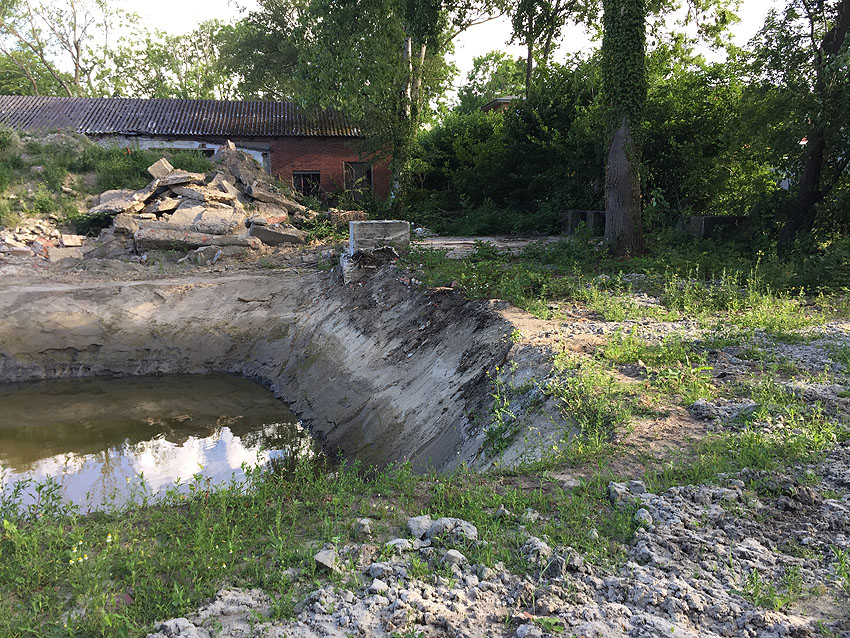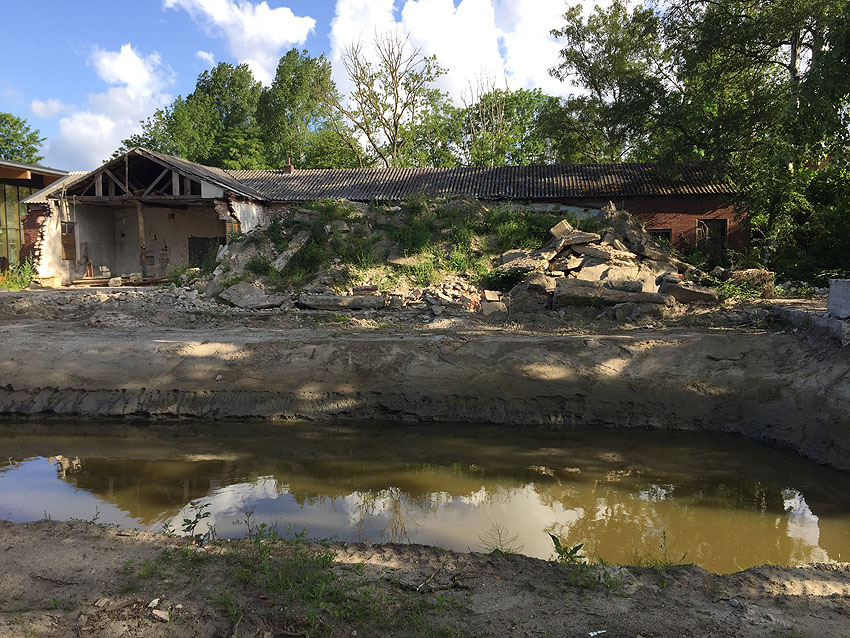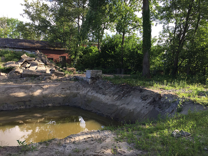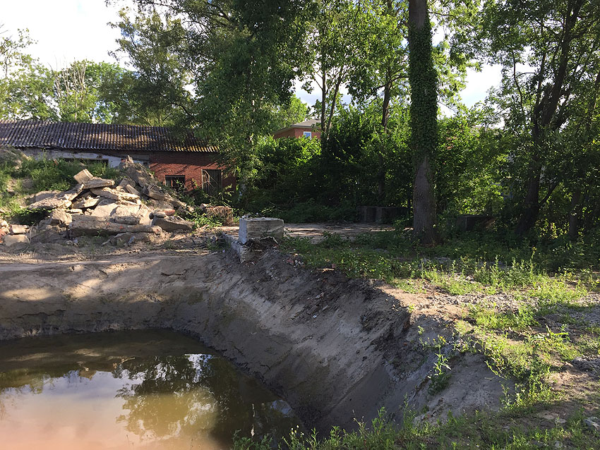 2023 finden hier wieder Arbeiten statt. Ein weiterer verbliebener Gebäudebereich wurde bereits vor einiger Zeit abgebrochen und eine Art Teich wurde nun geschaffen. Ein neuzeitlicher Feuerlöschteich soll dies doch wohl nicht werden (?). Gut zu sehen nun der Turm-Sockelbereich mit Fundament. Eventuell muss auch dieses Relikt nun bald weichen?