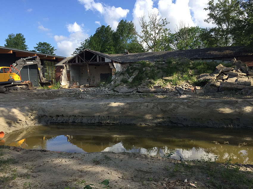 Der Westbereich der Gebäudeanlage ist abgerissen worden. Der Ostbereich dürfte erhalten bleiben. Wiederum östlich daran angrenzend befinden sich die Sockel.