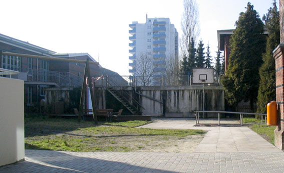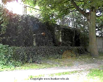 Die weisse Wand links gehört zum unmittelbar neben dem Bunker befindlichen umgebauten Hochbunker Rheinstraße 114.