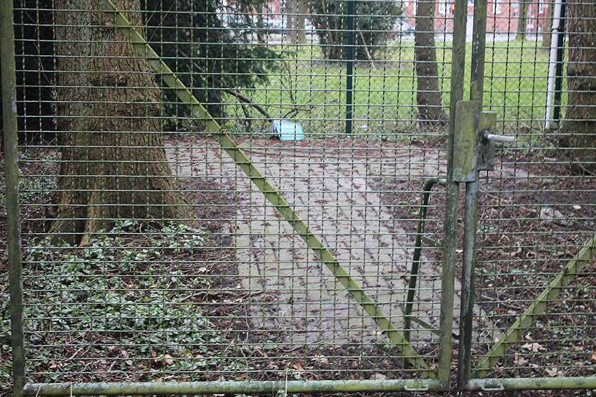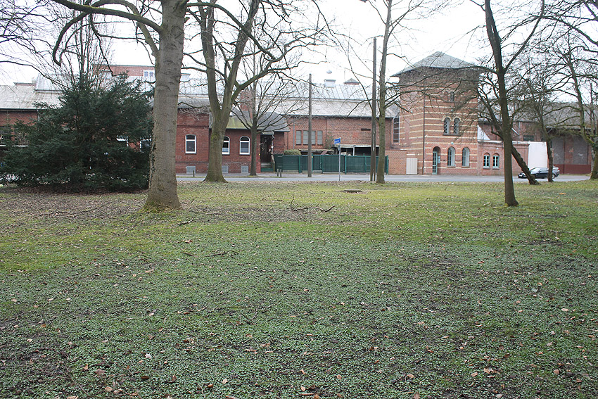 Der Standort heute. Links zu sehen das abgezäunte Gelände des späteren Nachkriegs-Tiefbrunnens Nr. 3... Der Brunnenschacht / Anschluss wird im Krieg zum Inneren des Turmes in dessen Westwand hinein fortgeführt haben.