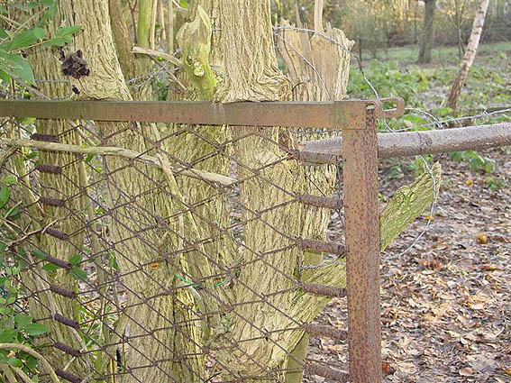 In der Nähe des Hochbunkers sind diese Behelfszäune aus Bettgestellen, welche aus dem Bunker stammen, anzufinden: